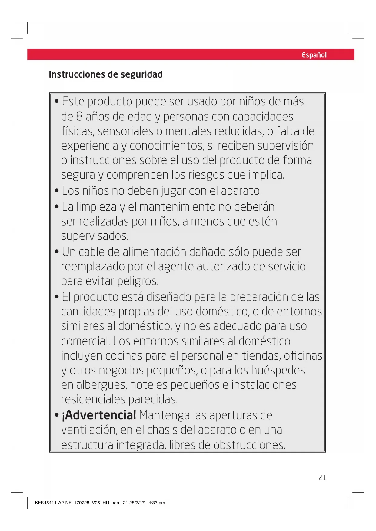- ¡Advertencia! Mantenga las aperturas de ventilación, en el chasis del aparato o en una estructura integrada, libres de obstrucciones. KFK45411-A2-NF_170728_V05_HR.indb 21 28/7/17 4:33 pmEspañol