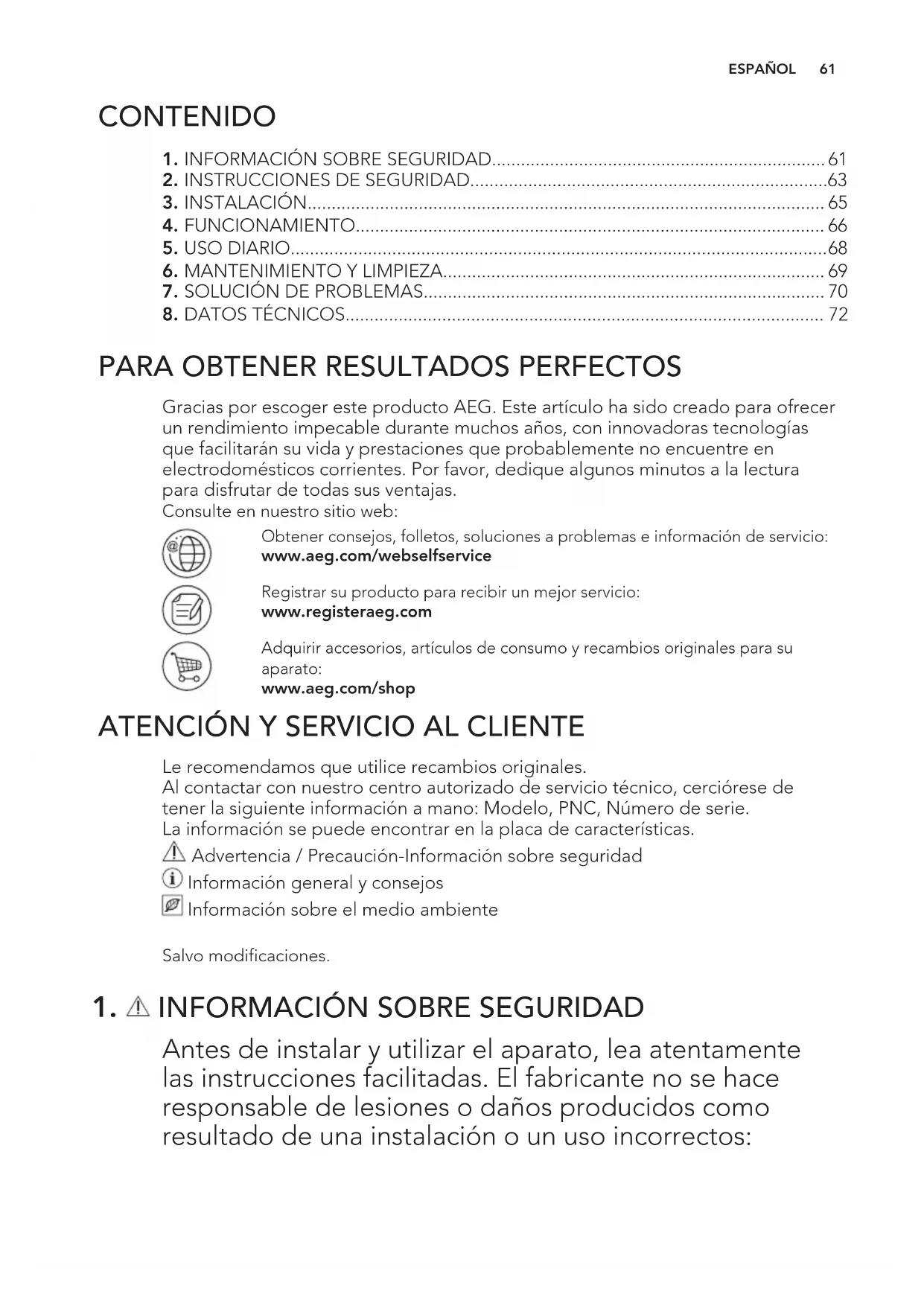 Gracias por escoger este producto AEG. Este artículo ha sido creado para ofrecer un rendimiento impecable durante muchos años, con innovadoras tecnologías que facilitarán su vida y prestaciones que probablemente no encuentre en electrodomésticos corrientes. Por favor, dedique algunos minutos a la lectura para disfrutar de todas sus ventajas. Consulte en nuestro sitio web: Obtener consejos, folletos, soluciones a problemas e información de servicio: www.aeg.com/webselfservice Registrar su producto para recibir un mejor servicio: www.registeraeg.com Adquirir accesorios, artículos de consumo y recambios originales para su aparato: www.aeg.com/shop