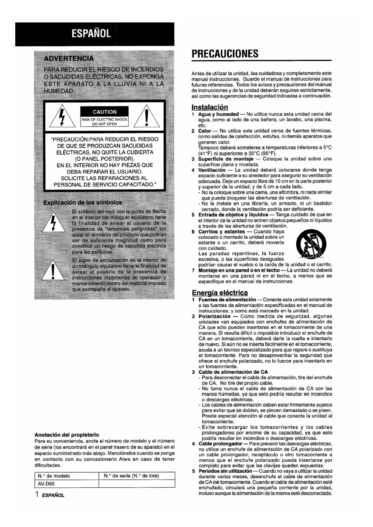 “’0 ENGLl!?H L.PRECAUCIONES Anotacion del propletario Para su conveniencia, anote el ntimero de modelo y el numero de serie (Ios encontrara en el panel trasero de su aparato) en el espacio suministrado mas abajo. Mencionelos cuando se ponga en contacto con su concesionario Aiwa en caso de tener dificultades. I N.” de modelo I N.” de serie (N.” de Iote) I AV-D5!5 1 ESPANOL Antes de utilizar la unidad, lea cuidadosa y completamente este manual instrucciones. Guarde el manual de instrucciones para futuras referencias. Todos Ios avisos y precauciones del manual de instrucciones y de la unidad deberan seguirse estrictamente, asi como Ias sugerencias de seguridad indicadas a continuation. Instalacion