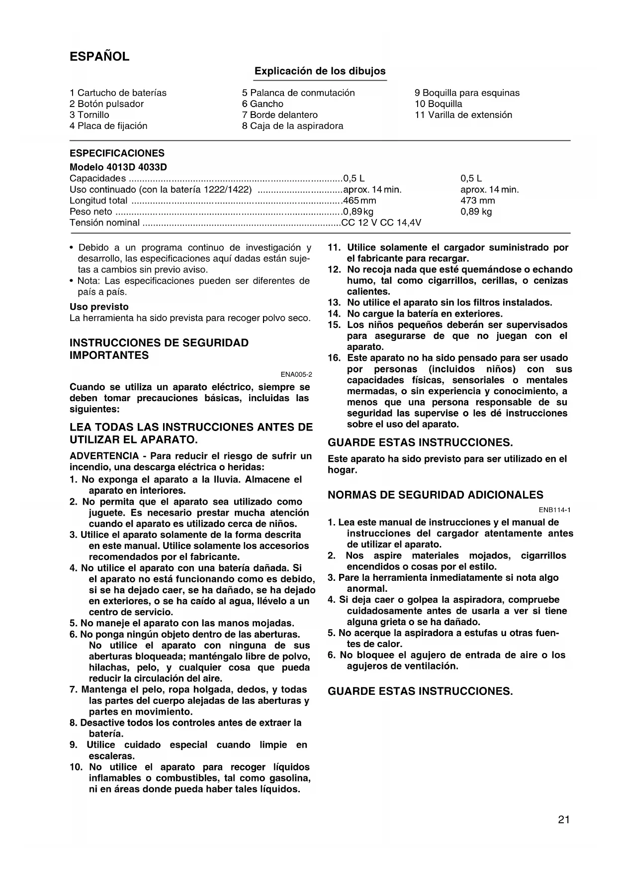 - Apague siempre la herramienta después de cada vez que la use para evitar dañarla y para alargar la vida útil de las baterías. Para poner en funcionamiento la aspiradora, deslice la palanca de conmutación hacia la posición “ I ”. Para detener la aspiradora, deslice la palanca de conmu- tación hacia la posición “O”. Modelo Tipo de batería Capacidad (mAh) Número de elementos 4013D 1200, 1220 1300 10 1202, 1222, 1202A
