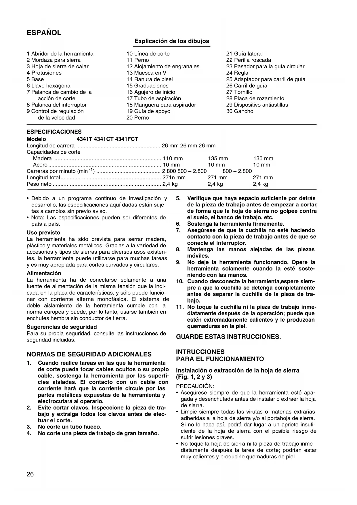 - Cuando desconecte la herramienta, espere siempre a que la cucilla se detenga Completely antes de Separar la cucilla de la pieza de trabajo.