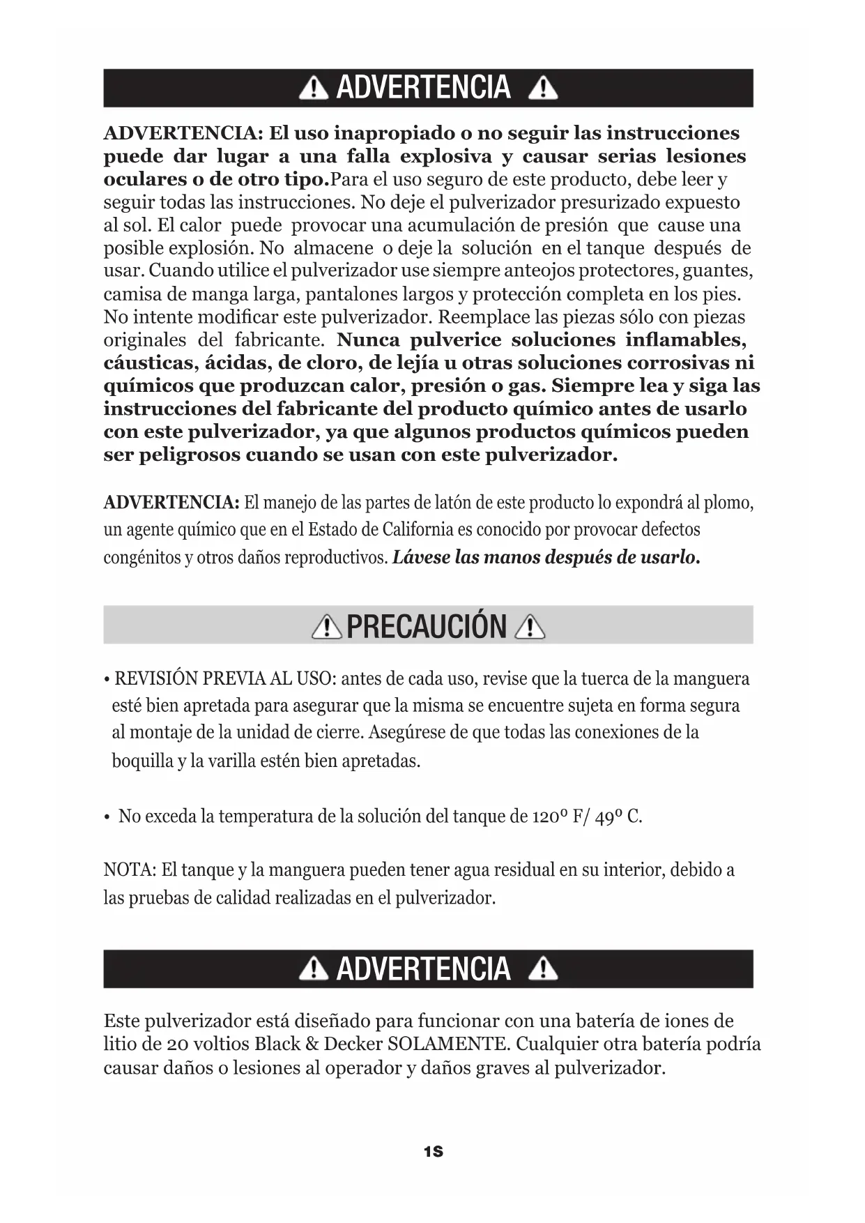 - No exceda la temperatura de la solución del tanque de 120º F/ 49º C. NOTA: El tanque y la manguera pueden tener agua residual en su interior, debido a las pruebas de calidad realizadas en el pulverizador. ADVERTENCIA PRECAUCIÓN Este pulverizador está diseñado para funcionar con una batería de iones de litio de 20 voltios Black & Decker SOLAMENTE. Cualquier otra batería podría causar daños o lesiones al operador y daños graves al pulverizador. ADVERTENCIA ADVERTENCIA: El uso inapropiado o no seguir las instrucciones puede dar lugar a una falla explosiva y causar serias lesiones oculares o de otro tipo.Para el uso seguro de este producto, debe leer y seguir todas las instrucciones. No deje el pulverizador presurizado expuesto al sol. El calor puede provocar una acumulación de presión que cause una posible explosión. No almacene o deje la solución en el tanque después de usar. Cuando utilice el pulverizador use siempre anteojos protectores, guantes, camisa de manga larga, pantalones largos y protección completa en los pies. No intente modificar este pulverizador. Reemplace las piezas sólo con piezas originales del fabricante. Nunca pulverice soluciones inamables, cáusticas, ácidas, de cloro, de lejía u otras soluciones corrosivas ni químicos que produzcan calor, presión o gas. Siempre lea y siga las instrucciones del fabricante del producto químico antes de usarlo con este pulverizador, ya que algunos productos químicos pueden ser peligrosos cuando se usan con este pulverizador.2S ADVERTENCIA:Para un funcionamiento seguro, lea este manual antes de utilizar el cargador. La batería no está completamente cargada cuando la extrae de la caja de cartón. Antes de utilizar la batería y el cargador, lea las instrucciones de seguridad a continuación. Luego, siga los procedimientos de carga detallados.