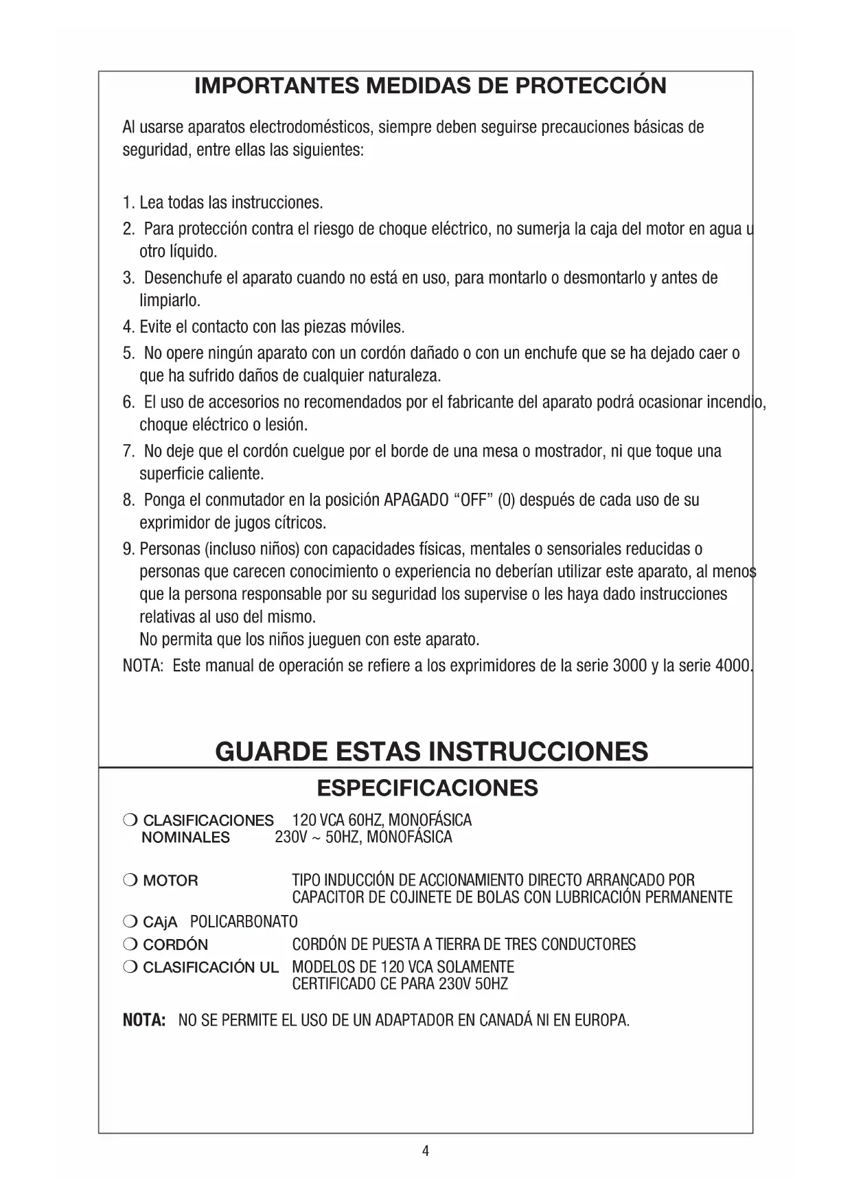 personas que carecen conocimiento o experiencia no deberían utilizar este aparato, al menos que la persona responsable por su seguridad los supervise o les haya dado instrucciones relativas al uso del mismo. No permita que los niños jueguen con este aparato. NOTA: Este manual de operación se refiere a los exprimidores de la serie 3000 y la serie 4000.