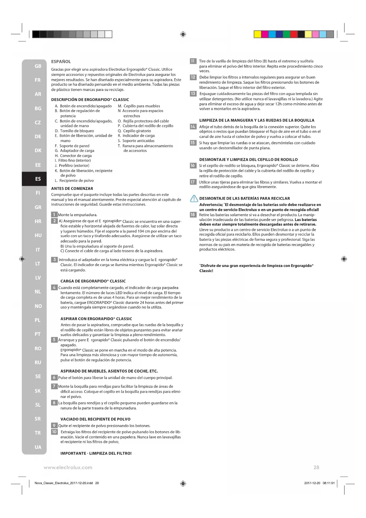 Nova_Classic_Electrolux_2017-12-20.indd 27 2017-12-20 08:11:01ESPAŃOL Gracias por elegir una aspiradora Electrolux Ergorapido® Classic. Utilice siempre accesorios y repuestos originales de Electrolux para asegurar los mejores resultados. Se han diseńado especialmente para su aspiradora. Este producto se ha diseńado pensando en el medio ambiente. Todas las piezas de plástico tienen marcas para su reciclaje.