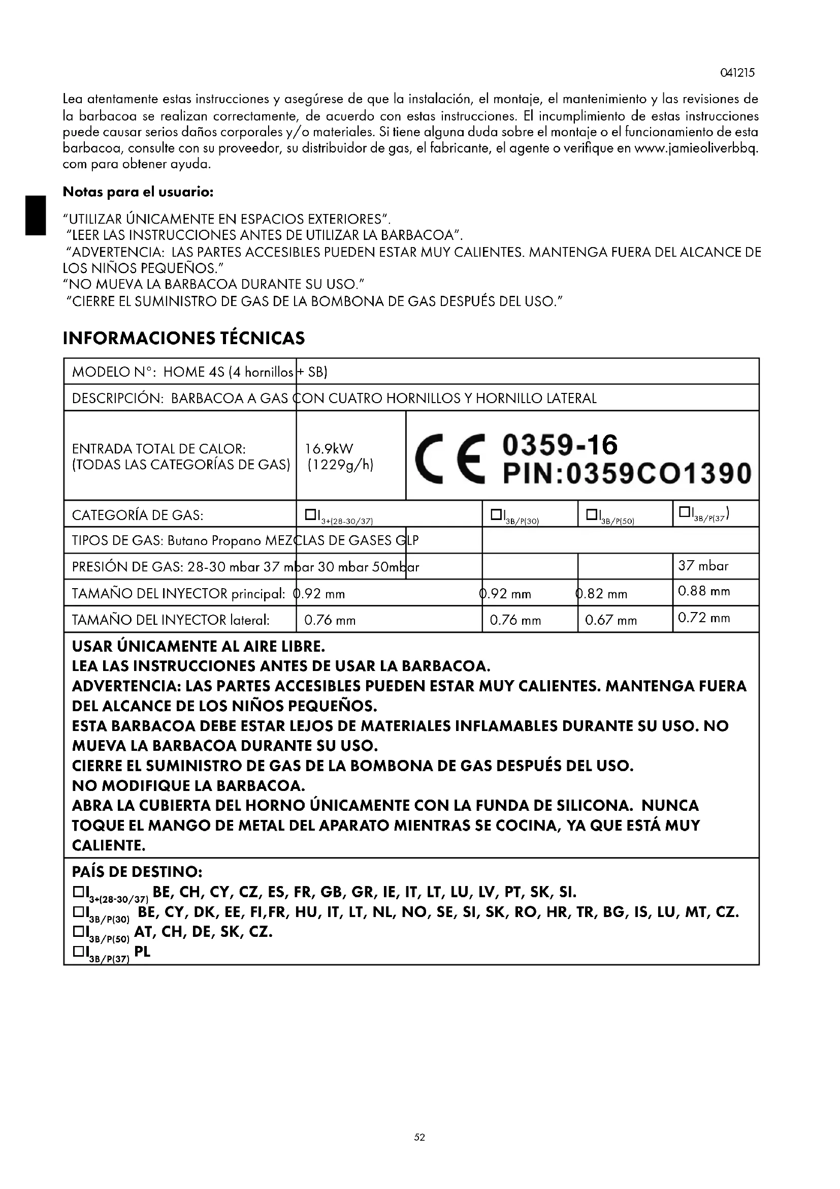 Lea atentamente estas instrucciones y asegúrese de que la instalación, el montaje, el mantenimiento y las revisiones de la barbacoa se realizan correctamente, de acuerdo con estas instrucciones. El incumplimiento de estas instrucciones puede causar serios daños corporales y/o materiales. Si tiene alguna duda sobre el montaje o el funcionamiento de esta barbacoa, consulte con su proveedor, su distribuidor de gas, el fabricante, el agente o verifique en www.jamieoliverbbq. com para obtener ayuda. Notas para el usuario: “UTILIZAR ÚNICAMENTE EN ESPACIOS EXTERIORES”. “LEER LAS INSTRUCCIONES ANTES DE UTILIZAR LA BARBACOA”. “ADVERTENCIA: LAS PARTES ACCESIBLES PUEDEN ESTAR MUY CALIENTES. MANTENGA FUERA DEL ALCANCE DE