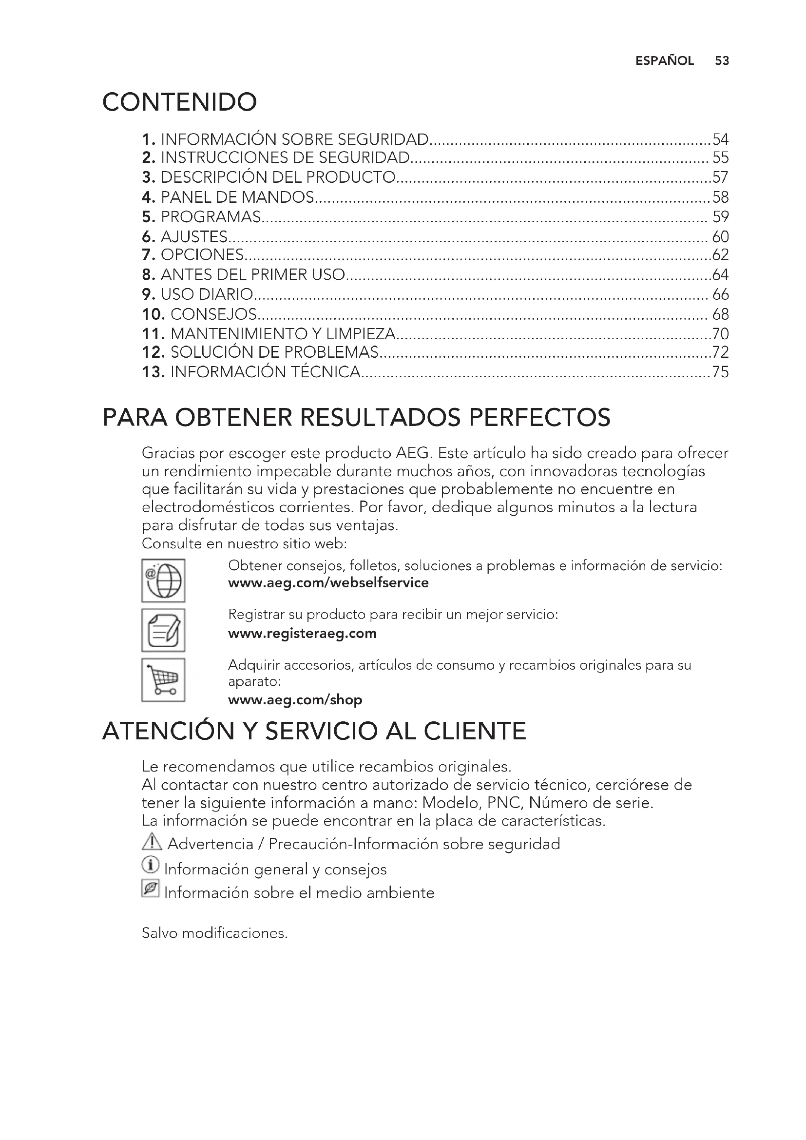 Gracias por escoger este producto AEG. Este articulo ha sido創造o para encontrar un rendimiento impecable durante muchos años, con innovadoras technologías que Facilitarán su vida y prestaciones que probablemente no Ocuentre en electrodomesticos corrientes. Por favor, dedique algunos Minutes a la lecture para disfrutar de todas sus ventajas.