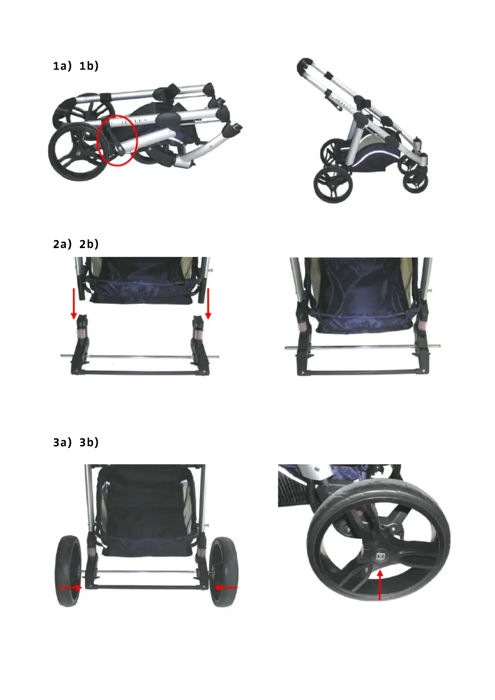 ES En lo referente a la carga permitida en el cochecito, consulte las indicaciones del fabricante o consulte a su establecimiento especializado. Conserve este manual de instrucciones para todo el período de uso del cochecito y, en el caso de que deje el cochecito a un tercero debe darle también estas instrucciones. Emplee únicamente piezas de recambio originales y accesorios recomendados por el fabricante. Si el cochecito dispone de un freno de retardación adicional, debe ajustarse de modo que no bloquee la rueda frenada. Si el cochecito tiene ruedas neumáticas, compruebe regularmente la presión de las ruedas (presionando ligeramente con los pulgares). La presión máxima de aire recomendada se muestra en el neumático. NOTA: los neumáticos de aire no puede causar manchas imborrables en el parquet laminado o en suelos de plástico. Cuidado y mantenimiento del cochecito: Tenga en cuenta las indicaciones de cuidado del fabricante en todas las piezas textiles extraíbles, desenfundables y lavables. Para la limpieza de las partes textiles no use productos de limpieza fuertes o abrasivos, sino agua con jabón o con un producto de limpieza especial para textiles. Limpie también con agua y jabón las partes de plástico y el chasis. Es necesario limpiar y secar el armazón si el cochecito ha sido usado bajo la lluvia o se ha mojado. Si se moja el tejido del cochecito hay que dejarlo secar extendido o colgado. Las ruedas se deben desmontar regularmente y tratar los ejes, todas las juntas de articulación y la suspensión con un aceite sin ácido (aceite de máquina de coser, WD40 o un agente contra agarrotamiento sin grasa). De esta forma el cochecito se moverá fácilmente y sin ruido y se limitará el desgaste natural prematuro. Procure mediante el cuidado adecuado que no aparezca óxido fino en el cochecito, ya que éste no es motivo de reclamación. Atención: se han empleado poliéster y mezclas de tejidos de algodón de acuerdo con las normas vigentes. En caso de esfuerzo fuerte durante mucho tiempo (p.ej. intensa exposición a la luz directa del sol) los tejidos naturales, sobre todo, pueden perder el color. Esto no constituye un motivo de reclamación. Notas importantes: Adecuado para niños con un peso máximo de 15 kg. Lea y conserve las instrucciones. Guarde el recibo de compra. Se reserva el derecho a cambios en el volumen de la oferta, los cambios técnicos y las desviaciones específicas del cliente. Los colores y las características del producto pueden ser diferentes a las imágenes mostradas. De acuerdo con la norma EN-1888 / 01.05.2012 De 10.12.2012 ESAbrir el cochecito: Abra el cerrojo de seguridad (fig.1a). Tire del pasador hacia arriba para abrir el cochecito por completo (fig. 1b). Colocar /quitar del eje trasero: Colocar: Coloque el eje trasero sobre el chasis (fig. 2a). Quitar: Presione ambos pernos de seguridad de metal que están en el lado interno (fig. 2b) y tire del eje para separarlo del chasis. Colocar / quitar las ruedas traseras: Fijar las ruedas traseras: Presione la rueda en el eje (fig. 3a). Quitar las ruedas traseras: Presione el botón de seguridad que (fig. 3b) está en el medio de la rueda y tire de la rueda para separarla del chasis. Colocar / quitar de las ruedas delanteras: Fijar las ruedas delanteras: Presione la rueda delantera en el eje de la suspensión del chasis (fig. 4a). Quitar las ruedas delanteras: Presione los dos botones de seguridad que se encuentran en la parte inferior de la suspensión (Fig. 4b) y retire la rueda. Función ruedas giratorias: Destrabar ruedas: Gire hacia adentro la palanca negra que se encuentra en el dispositivo de sujeción de las ruedas delanteras (fig. 5a). Fijar ruedas: Gire hacia afuera la palanca negra (fig.5b). Ajuste del respaldo: Para retirar el asiento, presione los dos botones que se encuentran en los laterales (fig. 6a). Si lo desea, puede fijar el asiento de forma tal que el niño esté EScolocado de espaldas a la dirección en la que se empuja el cochecito (fig. 6b). Compruebe que el asiento esté bien puesto tirando levemente del mismo hacia arriba. Presionando los botones podrá colocar el asiento en la posición deseada: estar sentado (fig. 6c) o reclinado. Frenar: Presionar los frenos: Presione con el pie la barra de freno (fig. 7a) Soltar el freno: Suba con el pie la barra de freno (fig. 7b) Atención: Si usted se detiene con el cochecito de bebé, no olvide poner el freno. Ajuste del reposapiés: Presione ambas palancas situadas en la parte inferior a la derecha y a la izquierda (fig.8). Cinturón de seguridad: Para colocar el cinturón abroche ambas hebillas del cinturón (A + B) en la hebilla del medio (C). Para quitar el cinturón presione los clips laterales de las hebillas y tire hacia afuera (fig.9). Pasador ajustable: Presionando la palanca de seguridad del pasador (fig. 10a) podrá ajustar la distancia del pasador (fig.10b). Atención: Asegúrese de que su hijo/a no toque ni con las manos ni con otra parte de su cuerpo ninguna parte móvil. Poner/quitar el toldo: Inserte los dos clips de plástico del toldo en las dos guías de plástico situadas a la derecha y a la izquierda del asiento (fig.11a). Para retirar el toldo, presione los dos botones de plástico (fig.11b) y tire del toldo hacia arriba. Atención: Antes de plegar el cochecito, pliegue siempre primero el toldo. ESPoner/quitar el asa: Coloque la barra en las dos aberturas previstas para ello que encontrará en el asiento (fig.12a). Para quitar la barra, presione los botones laterales situados en la parte inferior de la barra (fig.12b) y tire de la misma para separarla de la fijación. Armar el cochecito: Armado: Retire el colchón (superficie de apoyo) y deslice ambas abrazaderas hacia afuera hasta que encajen en las muescas y el cochecito esté desplegado (fig. 13a). Ahora puede poner el colchón en el bolso de traslado. Plegar: Primero, retire el colchón (superficie de apoyo) y deslice ambas abrazaderas hacia adentro (fig.