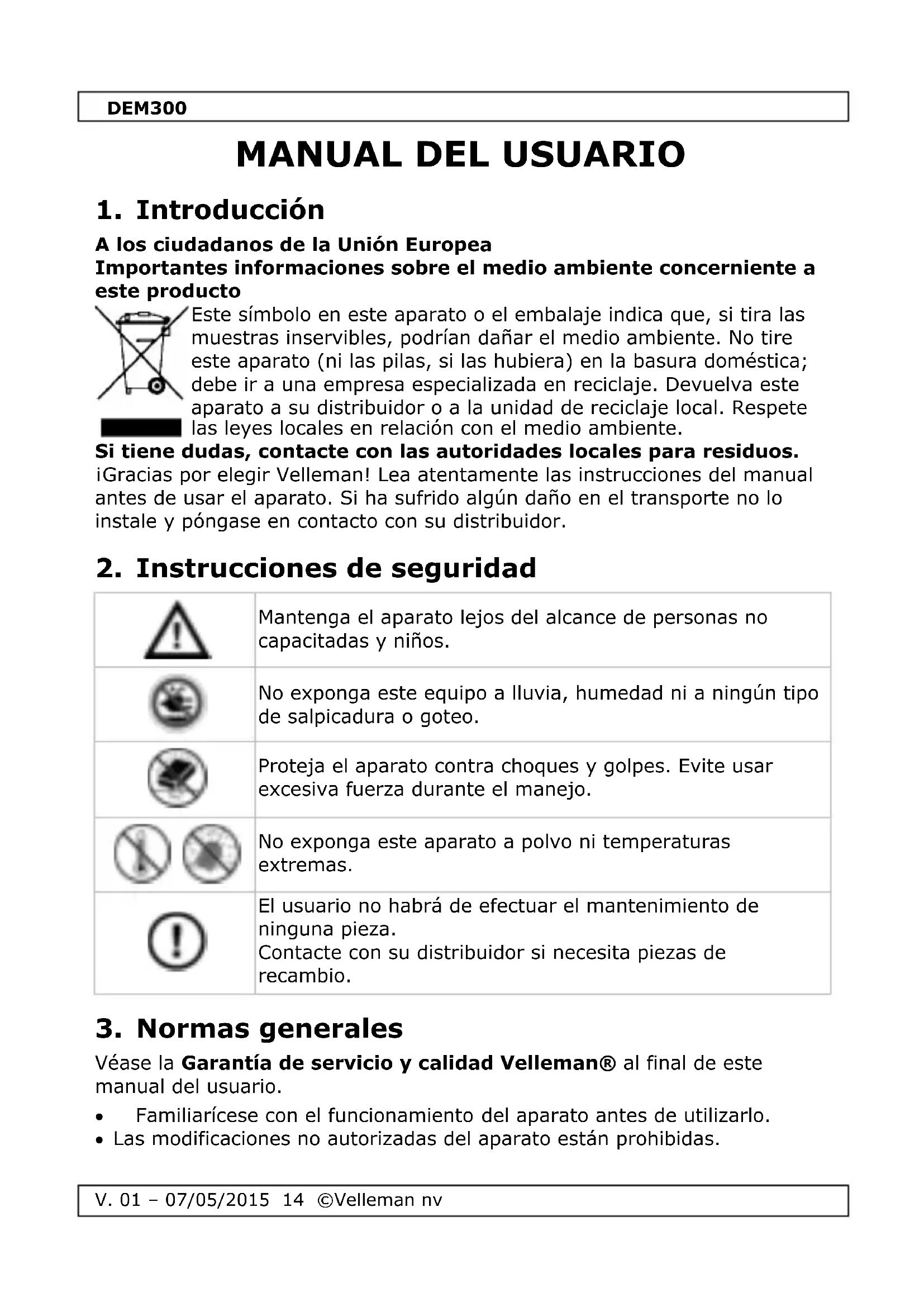 Véase la Garantía de servicio y calidad Velleman® al final de este manual del usuario. Familiarícese con el funcionamiento del aparato antes de utilizarlo. Las modificaciones no autorizadas del aparato están prohibidas.DEM300