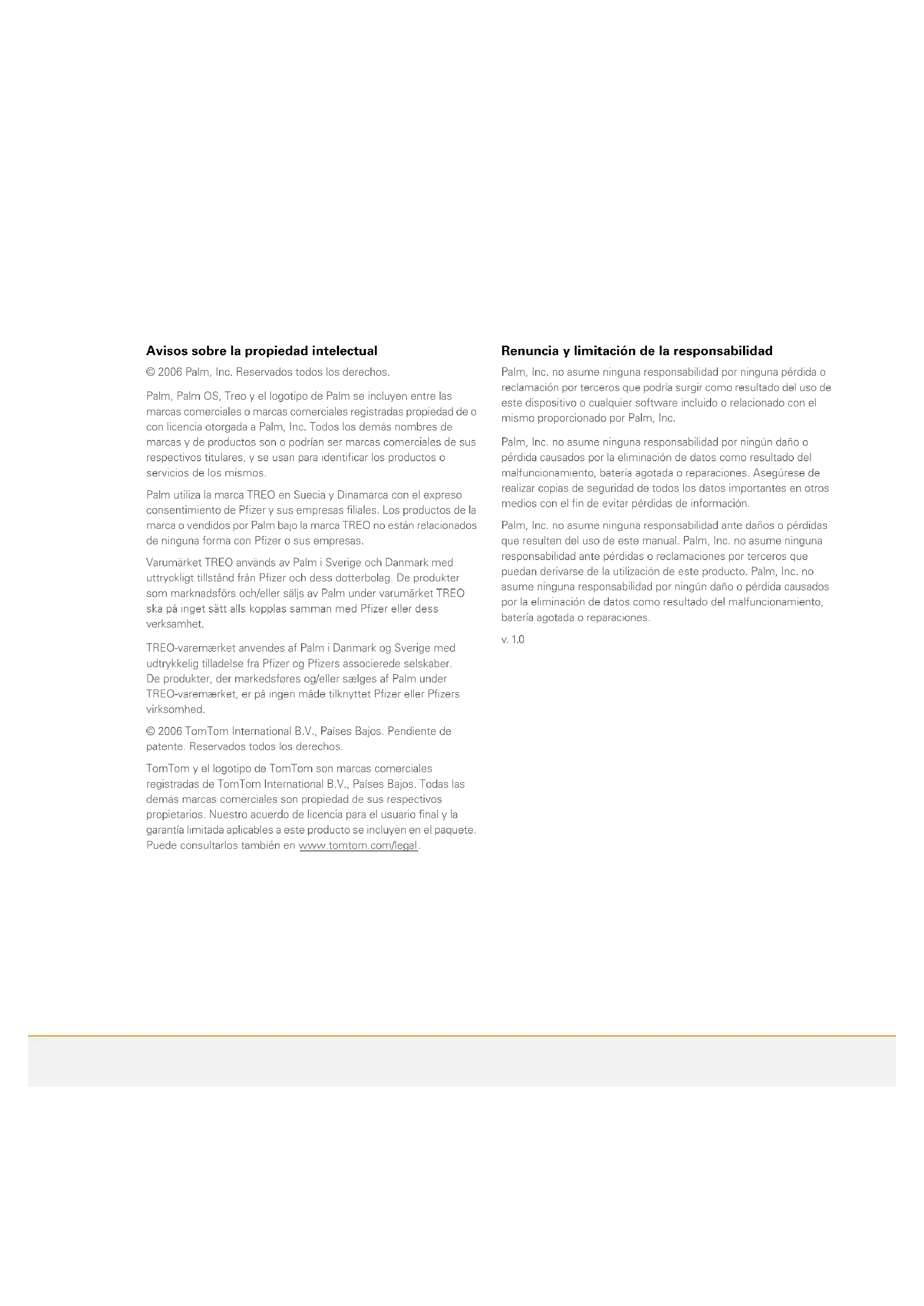- La rapidité avec laquelle vous touchez, branchez et débranchez des appareils électroniques. Vous devez toujours prendre les précautions appropriées pour libérer de l’électricité statique. De plus, si vous vous trouvez dans un environnement où vous notez la présence de décharges électrostatiques, il est souhaitable de prendre des précautions particulières pour protéger vos équipements électroniques contre les ESD. Pour des informations sur les programmes environnementaux, consultez www.palm.com/environment .INFORMATIONS IMPORTANTES RELATIVES À LA SÉCURITÉ ET INFORMATIONS LÉGALES 44Avisos sobre la propiedad intelectual © 2006 Palm, Inc. Reservados todos los derechos. Palm, Palm OS, Treo y el logotipo de Palm se incluyen entre las marcas comerciales o marcas comerciales registradas propiedad de o con licencia otorgada a Palm, Inc. Todos los demás nombres de marcas y de productos son o podrían ser marcas comerciales de sus respectivos titulares, y se usan para identificar los productos o servicios de los mismos. Palm utiliza la marca TREO en Suecia y Dinamarca con el expreso consentimiento de Pfizer y sus empresas filiales. Los productos de la marca o vendidos por Palm bajo la marca TREO no están relacionados de ninguna forma con Pfizer o sus empresas. Varumärket TREO används av Palm i Sverige och Danmark med uttryckligt tillstånd från Pfizer och dess dotterbolag. De produkter som marknadsförs och/eller säljs av Palm under varumärket TREO ska på inget sätt alls kopplas samman med Pfizer eller dess verksamhet. TREO-varemærket anvendes af Palm i Danmark og Sverige med udtrykkelig tilladelse fra Pfizer og Pfizers associerede selskaber. De produkter, der markedsføres og/eller sælges af Palm under TREO-varemærket, er på ingen måde tilknyttet Pfizer eller Pfizers virksomhed. © 2006 TomTom International B.V., Países Bajos. Pendiente de patente. Reservados todos los derechos. TomTom y el logotipo de TomTom son marcas comerciales registradas de TomTom International B.V., Países Bajos. Todas las demás marcas comerciales son propiedad de sus respectivos propietarios. Nuestro acuerdo de licencia para el usuario final y la garantía limitada aplicables a este producto se incluyen en el paquete. Puede consultarlos también en www.tomtom.com/legal