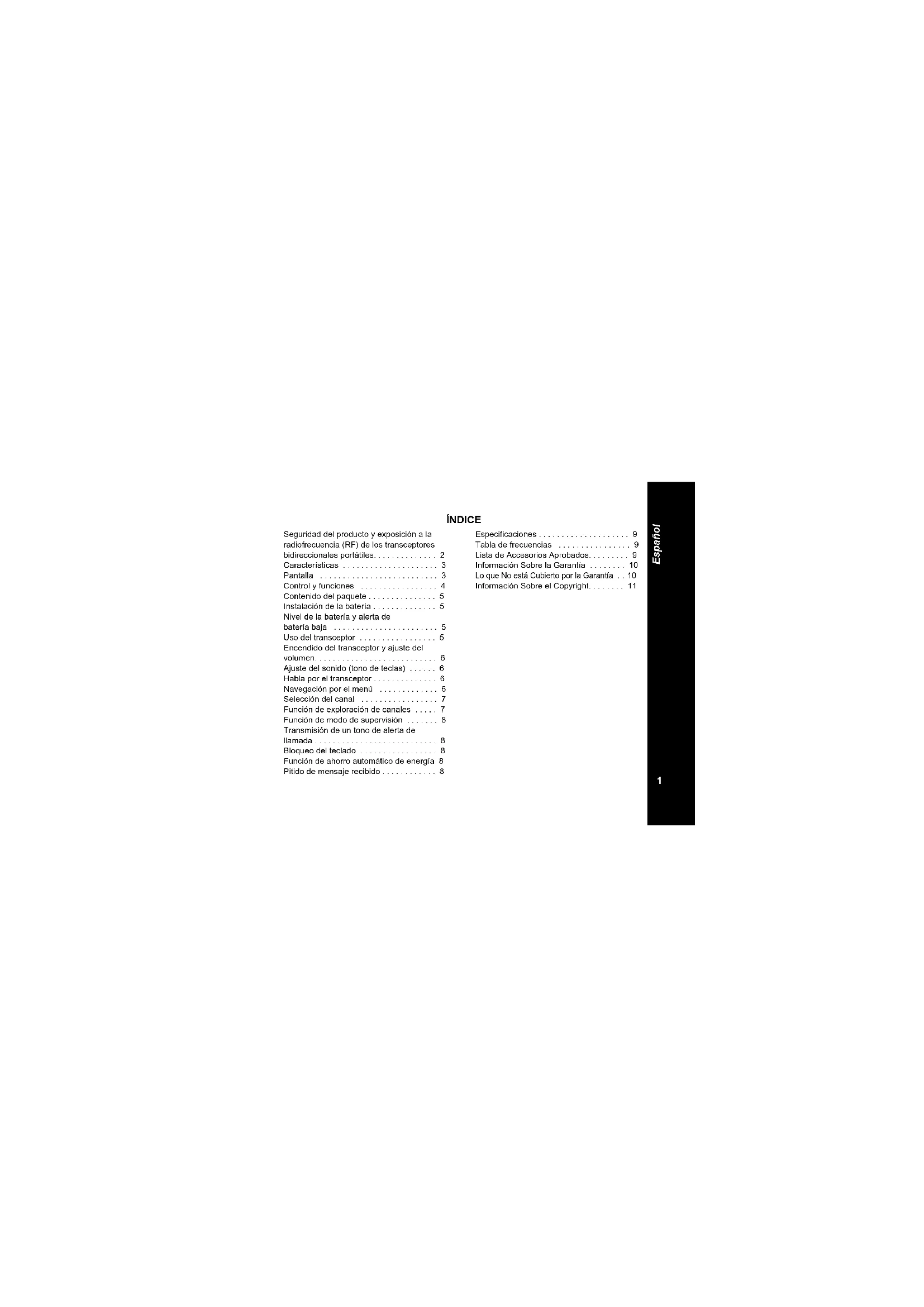 - Español ÍNDICE Seguridad del producto y exposición a la radiofrecuencia (RF) de los transceptores bidireccionales portátiles p. 2