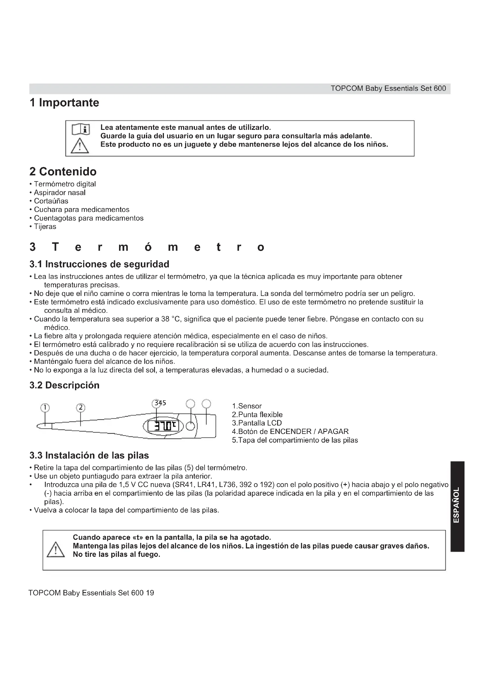 - Vuelva a ajustar la tapa. Alcance de medición Exactitud Resolución Condiciones de funcionamiento Condiciones de almacenamiento Pila Duración de la pila Consumo de energía Dimensiones Peso 32,0 ~ 43 °C +/-0,1 °C (35,0 °C ~ 39 °C) +/-0,2 °C (reposo) 0,1 °C Temperatura 0 ~ 50 °C Humedad 10 ~ 83 % Temperatura -20 ~ 60 °C Humedad 10 ~ 83 % 1,5 V CC alcalina de manganeso SR41, LR41, L736, 392 o 192 Aproximadamente 100 horas de funcionamiento continuo 10 minutos al día durante 18 meses 0,15 mW 152 x 21,5 x 14 mm Aproximadamente 16,8 gramos con la pila Nunca introduzca demasiado el aspirador en las fosas nasales. Lávelo siempre después de cada uso. No lo use nunca en la boca o en las orejas del bebé. No lo guarde en un lugar expuesto a la luz directa del sol o con temperaturas elevadas. Baby Essentials Set 600.book Page 21 Friday, June 26, 2009 1:19 PMTOPCOM Baby Essentials Set 600 22 TOPCOM Baby Essentials Set 600 5 Cuchara para medicamentos