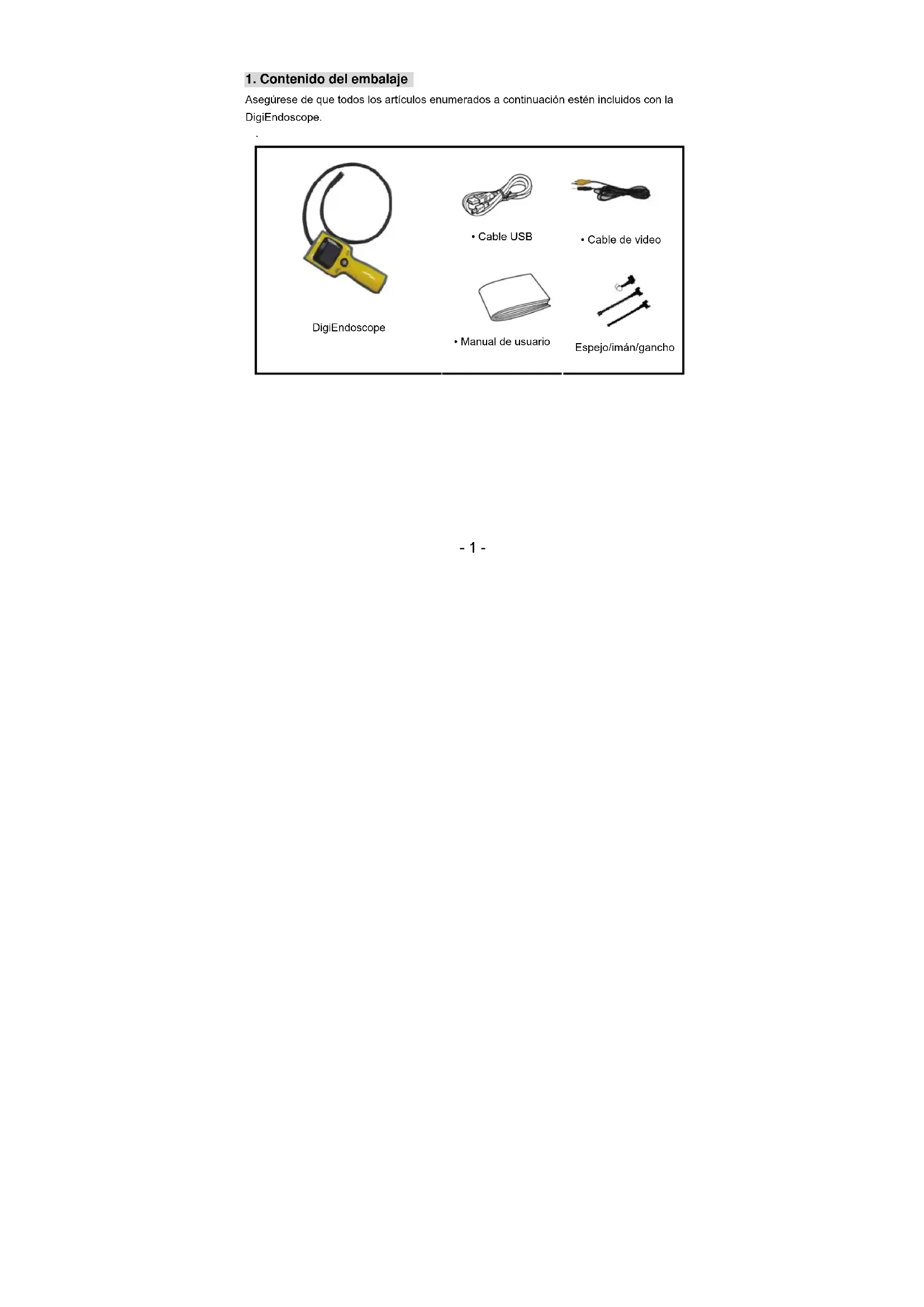 Asegúrese de que todos los artículos enumerados a continuación estén incluidos con la DigiEndoscope.