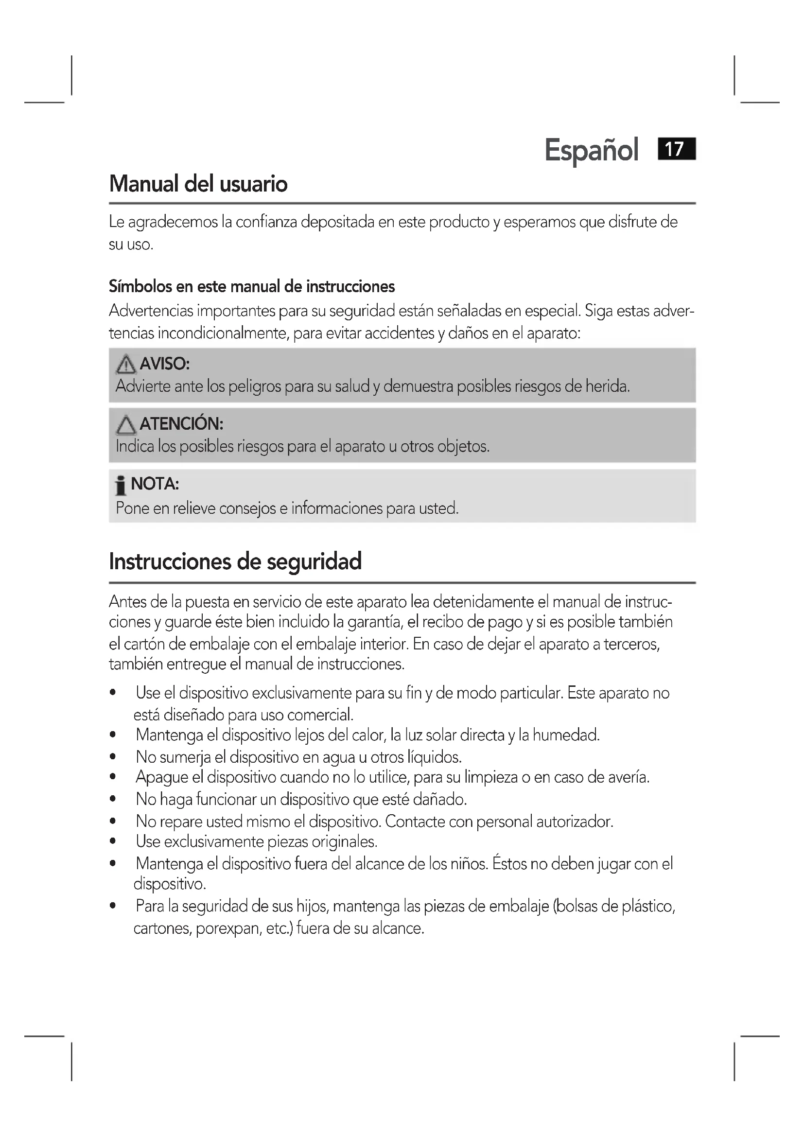 Antes de la puesta en servicios de este aparato lea detenidamente el manual de instrucciones y guarde este bien incluido la garantía, el recibo de pago y si es posible también el cartón de embalaje con el embalaje interior. En caso de estar el aparato a cerceros, también entrega el manual de instructaciones.