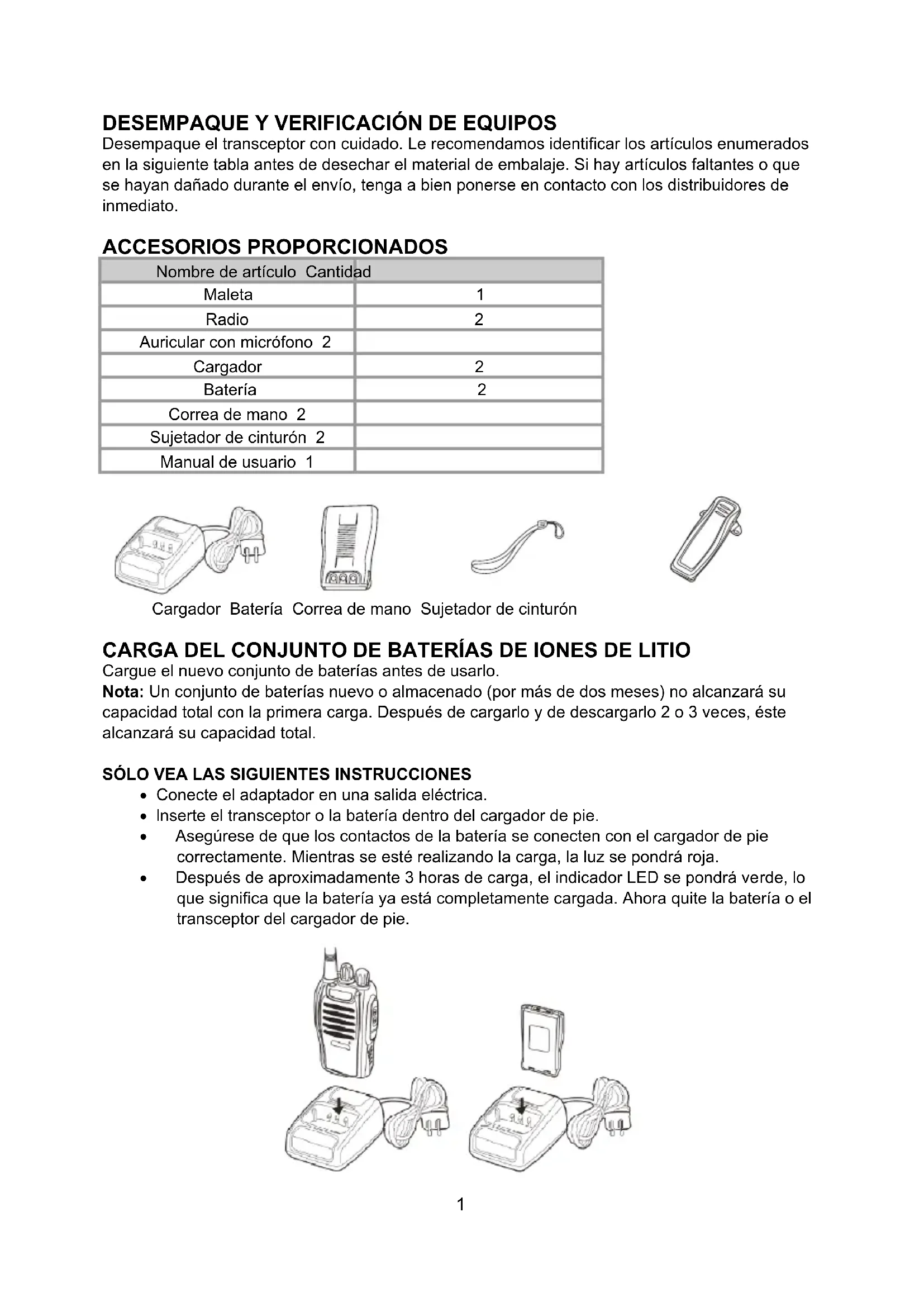 Desempaque el transceptor con cuidado. Le recomendamos identificar los artículos enumerados en la siguiente tabla antes de desechar el material de embalaje. Si hay artículos faltantes o que se hayan dañado durante el envío, tenga a bien ponerse en contacto con los distribuidores de inmediato. ACCESORIOS PROPORCIONADOS Nombre de artículo Cantidad Maleta 1 Radio 2 Auricular con micrófono 2 Cargador 2 Batería 2 Correa de mano 2 Sujetador de cinturón 2 Manual de usuario 1