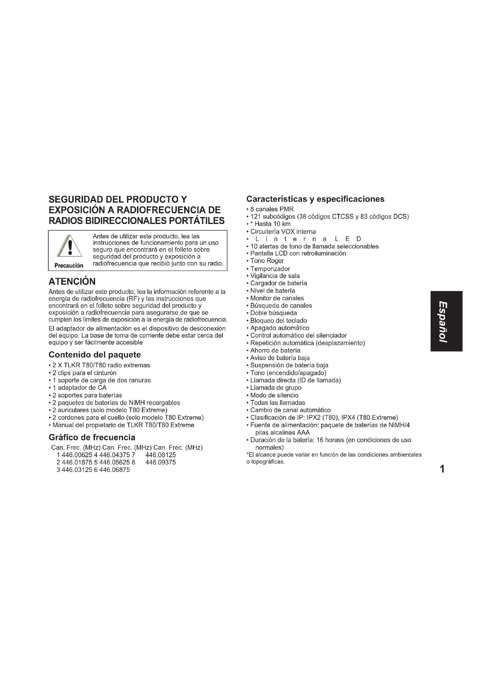 - Duración de la batería: 16 horass (en condiciones de uso normales) *El alcance puede variar en función de las condiciones ambientales o topográficas. Antes de utilizar este producto, lea las instrucciones de funcionamiento para un uso seguro que encontrará en el folleto sobre seguridad del producto y exposición a radiofrecuencia que recibió junto con su radio. Can. Frec. (MHz) Can. Frec. (MHz) Can. Frec. (MHz)