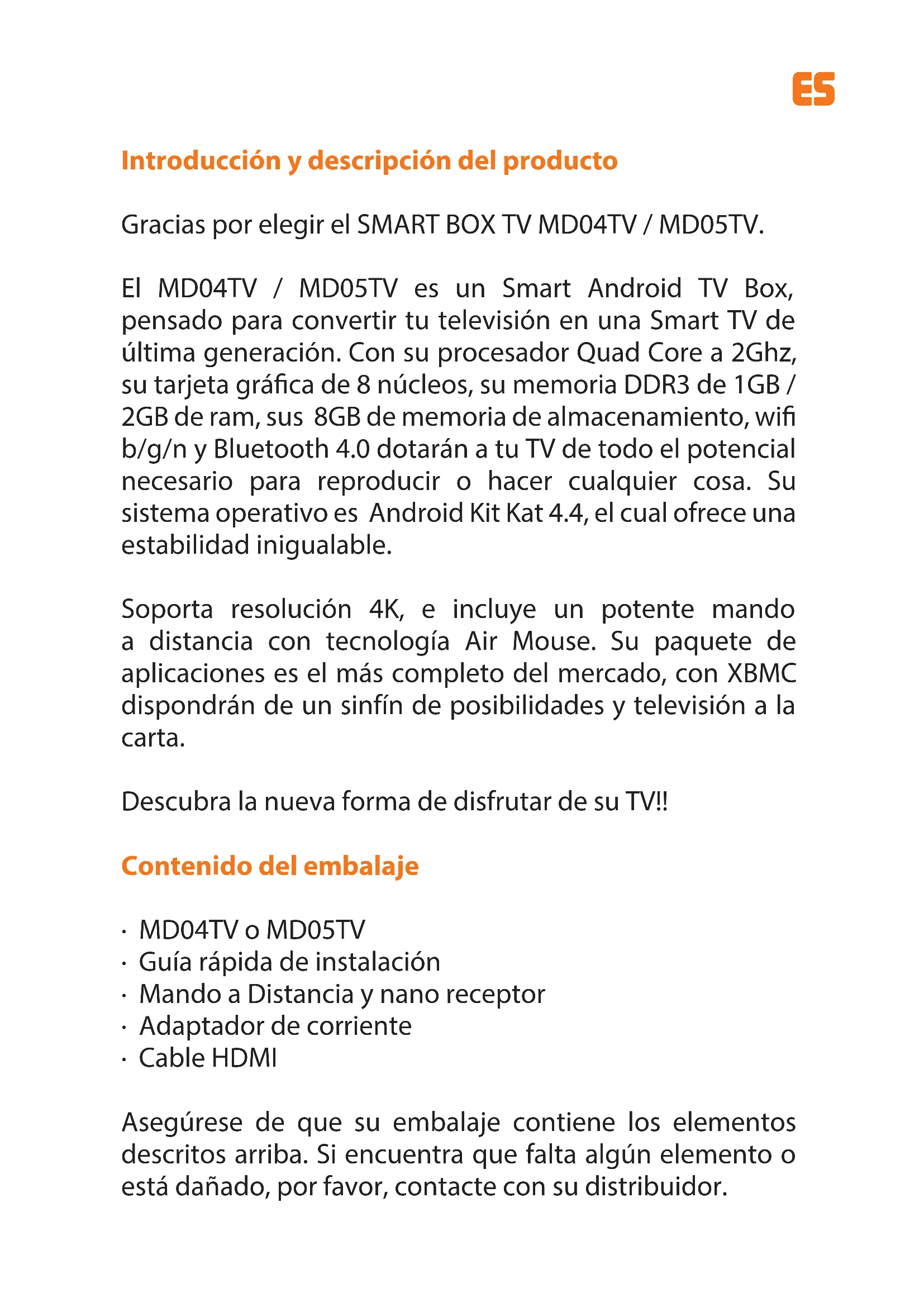 MD05TV el nano receptor del Air mouse para comenzar con el manejo del dispositivo. Encender y Apagar 1.El dispositivo se encenderá automáticamente una vez haya sido alimentado por el Puerto DC, tal y como describe el paso anterior. 2.Para apagar el dispositivo pulse el botón de encendido del Air mouse (control remoto) durante unos segundos y para volver a encenderlo pulse el botón de encendido del Air mouse durante unos segundos hasta que se encienda el led azul. Ajuste de pantalla Para ajustar la pantalla al tamaño de su TV, diríjase a Ajustes – Pantalla – Posición de la Pantalla y siga las indicaciones.ES Como abrir aplicaciones Mueva el cursor sobre el icono My Apps (Mis aplicaciones) y haga clic sobre el icono. Aplicaciones recientemente usadas Haga clic en el icono para ver todas las aplicaciones que se están ejecutando .ES Puede seleccionar la deseada para traerla al frente. Como cerrar aplicaciones Haga clic en el icono para ver todas las aplicaciones en ejecución, elija uno de ellos haciendo clic y manteniéndolo, arrástrelo a la zona superior hasta que cierre la aplicación. Moverse entre pantallas del escritorio Haga clic y mantenga pulsado en el escritorio, mueva a la izquierda o derecha para ver otras pantallas.ES Volver a la pantalla principal o escritorio Haga clic en el icono para volver a la pantalla principal. Escribir Haga clic en el cuadro donde desea escribir algo y el teclado virtual se abrirá para escribir cualquier texto. Conectar y leer datos de dispositivos externos 1.Conectar Disco duro externo: Conecte el disco duro externo a un Puerto Usb del MD04TV /MD05TV, haga clic en la aplicación FileBrowser. El almacenamiento “USB” será habilitado.ES 2.Conectar Tarjeta Micro SD: Conecte una tarjeta SD al puerto SD del MD04TV o MD05TV, haga clic en la aplicación explorador. El almacenamiento “SD Card” será habilitado. Conexión WIFI Pulse en el icono Ajustes y seleccione Wi-Fi, le aparecerá los puntos de accesos Wi-Fi en el rango de cobertura.ES Seleccione la red inalámbrica deseada e introduzca la clave WiFi para con conectar. Conexión por cable RJ-45 Conecte el cable RJ-45 al puerto correspondiente en el MD04TV o MD05TV. Pulse en el icono Ajustes y seleccione Ethernet, le conectará automáticamente si tiene el DHCP de su router habilitado.ES Ajustes de Pantalla (Display) En esta pantalla podrá ajustar las opciones de pantalla. Ajustes Avanzado (Advanced) En esta pantalla podrá ajustar opciones como miracast, salida de audio digital, etc.ES Otros Ajustes (Other) En esta pantalla podrá ajustar opciones de sistemas pulsando el botón More Settings. Conexión Bluetooth Diríjase a Ajustes - Otros- Más Ajustes-Bluetooth y cambie el interruptor a la posición ON. Haga clic en el dispositivo Bluetooth deseado que aparece a la derecha e introduzca el PIN necesario (generalmente es “0000” o “1234”) para conectarse al dispositivo.ES Esta imagen muestra el dispositivo Bluetooth conectado. Conexión Pantalla Inalambrica Miracast Haga clic en la aplicación “Miracast”, seleccione el dispositivo miracast deseado y pulse en conectar.ES En el smartphone Ir a la interfaz de conguración de pantalla inalámbrica en su smartphone, habilite la función pantalla inalámbrica y haga clic en el nombre del dispositivo MD04TV / MD05TV para conectar. Una vez conectado, se puede disfrutar de películas, juegos en la televisión.