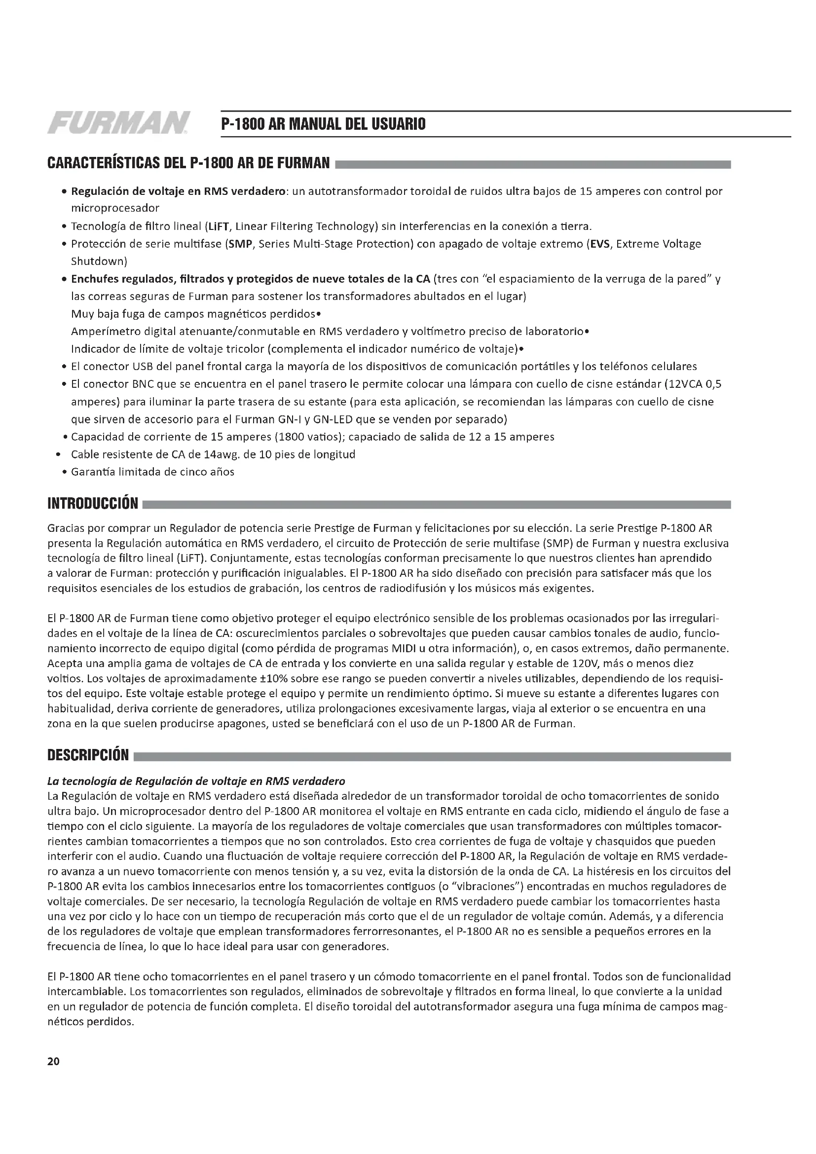 CaraCterÍstiCas deL P-1800 ar de FurMaN Regulación de voltaje en RMS verdadero• : un autotransformador toroidal de ruidos ultra bajos de 15 amperes con control por microprocesador Tecnología de ltro lineal (• LiFT, Linear Filtering Technology) sin interferencias en la conexión a erra. Protección de serie mulfase (• SMP, Series Mul-Stage Protecon) con apagado de voltaje extremo (EVS, Extreme Voltage Shutdown) Enchufes regulados, ltrados y protegidos de nueve totales de la CA • (tres con “el espaciamiento de la verruga de la pared” y las correas seguras de Furman para sostener los transformadores abultados en el lugar) Muy baja fuga de campos magnécos perdidos• Amperímetro digital atenuante/conmutable en RMS verdadero y volmetro preciso de laboratorio• Indicador de límite de voltaje tricolor (complementa el indicador numérico de voltaje)• El conector USB del panel frontal carga la mayoría de los disposivos de comunicación portáles y los teléfonos celulares• El conector BNC que se encuentra en el panel trasero le permite colocar una lámpara con cuello de cisne estándar (12VCA 0,5 • amperes) para iluminar la parte trasera de su estante (para esta aplicación, se recomiendan las lámparas con cuello de cisne que sirven de accesorio para el Furman GN-I y GN-LED que se venden por separado) Capacidad de corriente de 15 amperes (1800 vaos); capaciado de salida de 12 a 15 amperes• Cable resistente de CA de 14awg. de 10 pies de longitud • Garana limitada de cinco años• iNtrOduCCiÓN Gracias por comprar un Regulador de potencia serie Presge de Furman y felicitaciones por su elección. La serie Presge P-1800 AR presenta la Regulación automáca en RMS verdadero, el circuito de Protección de serie mulfase (SMP) de Furman y nuestra exclusiva tecnología de ltro lineal (LiFT). Conjuntamente, estas tecnologías conforman precisamente lo que nuestros clientes han aprendido a valorar de Furman: protección y puricación inigualables. El P-1800 AR ha sido diseñado con precisión para sasfacer más que los requisitos esenciales de los estudios de grabación, los centros de radiodifusión y los músicos más exigentes. El P-1800 AR de Furman ene como objevo proteger el equipo electrónico sensible de los problemas ocasionados por las irregulari- dades en el voltaje de la línea de CA: oscurecimientos parciales o sobrevoltajes que pueden causar cambios tonales de audio, funcio- namiento incorrecto de equipo digital (como pérdida de programas MIDI u otra información), o, en casos extremos, daño permanente. Acepta una amplia gama de voltajes de CA de entrada y los convierte en una salida regular y estable de 120V, más o menos diez volos. Los voltajes de aproximadamente ±10% sobre ese rango se pueden converr a niveles ulizables, dependiendo de los requisi- tos del equipo. Este voltaje estable protege el equipo y permite un rendimiento ópmo. Si mueve su estante a diferentes lugares con habitualidad, deriva corriente de generadores, uliza prolongaciones excesivamente largas, viaja al exterior o se encuentra en una zona en la que suelen producirse apagones, usted se beneciará con el uso de un P-1800 AR de Furman. desCriPCiÓN La tecnología de Regulación de voltaje en RMS verdadero La Regulación de voltaje en RMS verdadero está diseñada alrededor de un transformador toroidal de ocho tomacorrientes de sonido ultra bajo. Un microprocesador dentro del P-1800 AR monitorea el voltaje en RMS entrante en cada ciclo, midiendo el ángulo de fase a empo con el ciclo siguiente. La mayoría de los reguladores de voltaje comerciales que usan transformadores con múlples tomacor- rientes cambian tomacorrientes a empos que no son controlados. Esto crea corrientes de fuga de voltaje y chasquidos que pueden interferir con el audio. Cuando una uctuación de voltaje requiere corrección del P-1800 AR, la Regulación de voltaje en RMS verdade- ro avanza a un nuevo tomacorriente con menos tensión y, a su vez, evita la distorsión de la onda de CA. La histéresis en los circuitos del P-1800 AR evita los cambios innecesarios entre los tomacorrientes conguos (o “vibraciones”) encontradas en muchos reguladores de voltaje comerciales. De ser necesario, la tecnología Regulación de voltaje en RMS verdadero puede cambiar los tomacorrientes hasta una vez por ciclo y lo hace con un empo de recuperación más corto que el de un regulador de voltaje común. Además, y a diferencia de los reguladores de voltaje que emplean transformadores ferrorresonantes, el P-1800 AR no es sensible a pequeños errores en la frecuencia de línea, lo que lo hace ideal para usar con generadores. El P-1800 AR ene ocho tomacorrientes en el panel trasero y un cómodo tomacorriente en el panel frontal. Todos son de funcionalidad intercambiable. Los tomacorrientes son regulados, eliminados de sobrevoltaje y ltrados en forma lineal, lo que convierte a la unidad en un regulador de potencia de función completa. El diseño toroidal del autotransformador asegura una fuga mínima de campos mag- nécos perdidos.21 FRANÇAIS ENGLISH ESPAÑOL Nota: El P-1800 AR se debe ulizar sólo con voltaje de CA. Nunca deben ulizarse voltajes de CC. Además, no cambia ni regula la frecuencia de línea. La frecuencia de salida siempre será igual que la frecuencia de entrada. SMP (Protección de serie mulfase) con EVS (Apagado de voltaje extremo) La eliminación de sobretensión de la SMP (Protección de serie mulfase) de Furman práccamente descarta las visitas de servicio técnico y el costoso “empo de inacvidad”. Los circuitos de eliminación de sobretensión tradicionales se sacrican ellos mis- mos cuando se ven expuestos a múlples picos de sobrevoltaje transitorio, lo cual requiere la desmantelación de su sistema y la reparación de su eliminador de sobretensión. No sucede lo mismo con la SMP de Furman. Con SMP, los sobrevoltajes transitorios dañinos se absorben, sujetan y dispersan con seguridad. Su equipo conectado 