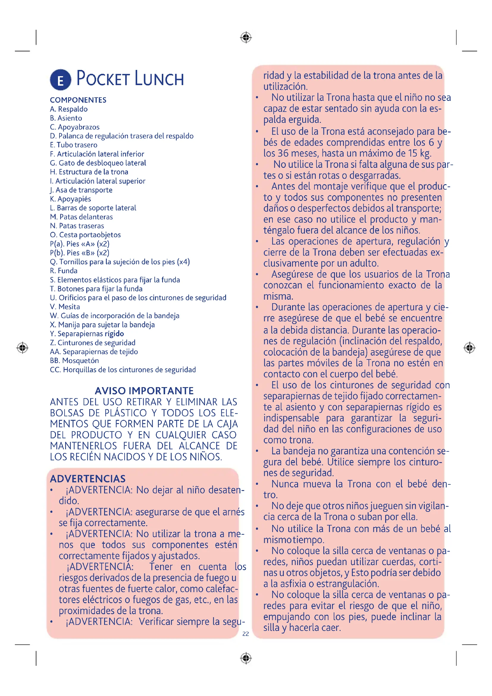 - ¡ADVERTENCIA: antes del uso, asegúrese de que todos los mecanismos de seguridad estén correctamente introducidos. En par- ticular, asegúrese de que la Trona esté blo- queada en posición abierta.