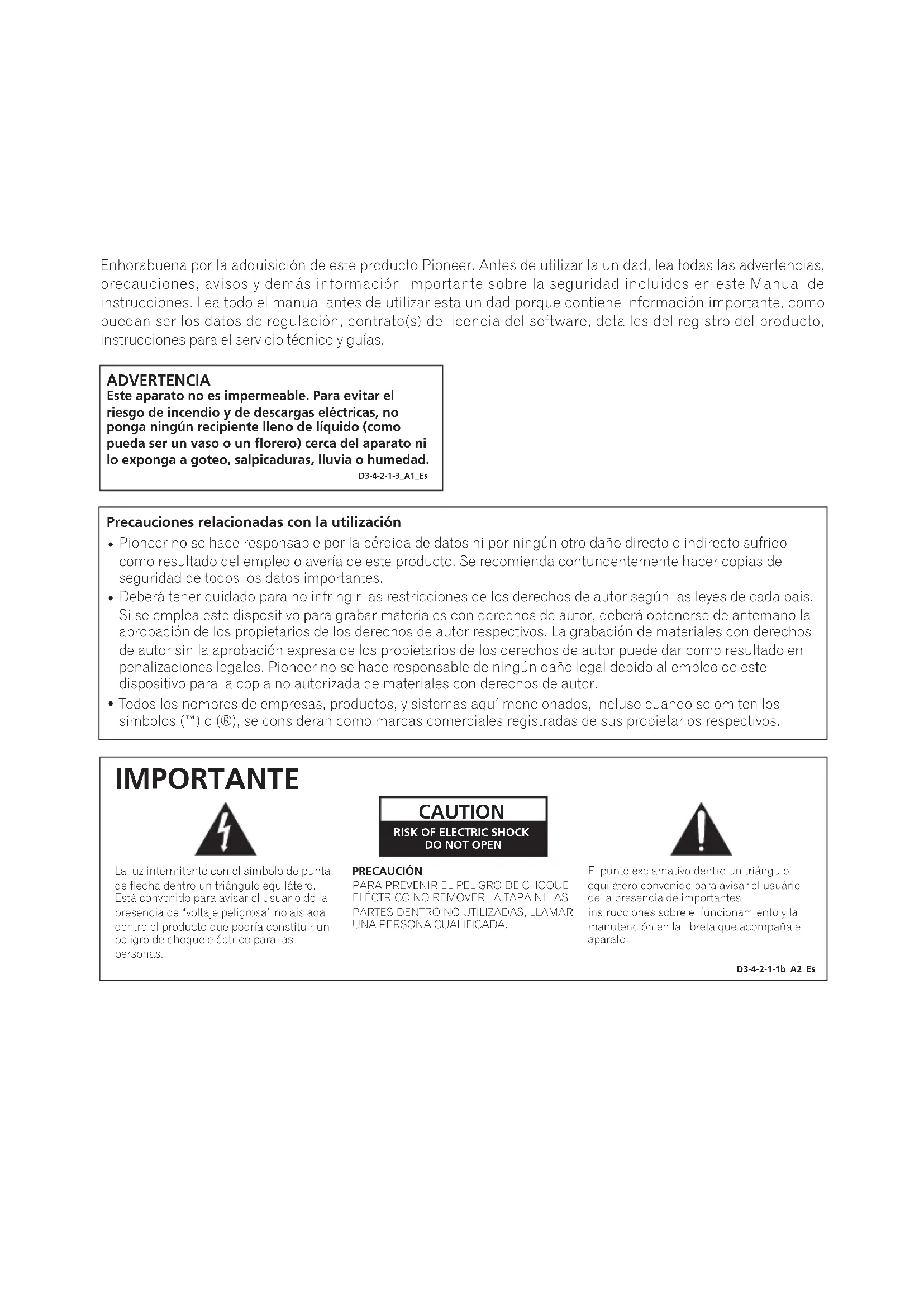 Pioneer no se hace responsable por la pérdida de datos ni por ningún otro daño directo o indirecto sufrido como resultado del empleo o avería de este producto. Se recomienda contundentemente hacer copias de seguridad de todos los datos importantes. Deberá tener cuidado para no infringir las restricciones de los derechos de autor según las leyes de cada país. Si se emplea este dispositivo para grabar materiales con derechos de autor, deberá obtenerse de antemano la aprobación de los propietarios de los derechos de autor respectivos. La grabación de materiales con derechos de autor sin la aprobación expresa de los propietarios de los derechos de autor puede dar como resultado en penalizaciones legales. Pioneer no se hace responsable de ningún daño legal debido al empleo de este dispositivo para la copia no autorizada de materiales con derechos de autor. Todos los nombres de empresas, productos, y sistemas aquí mencionados, incluso cuando se omiten los símbolos (™) o (®), se consideran como marcas comerciales registradas de sus propietarios respectivos. El punto exclamativo dentro un triángulo equilátero convenido para avisar el usuário de la presencia de importantes instrucciones sobre el funcionamiento y la manutención en la libreta que acompaña el aparato.La luz intermitente con el símbolo de punta de flecha dentro un triángulo equilátero. Está convenido para avisar el usuario de la presencia de “voltaje peligrosa” no aislada dentro el producto que podría constituir un peligro de choque eléctrico para las personas.PRECAUCIÓNPARA PREVENIR EL PELIGRO DE CHOQUE ELÉCTRICO NO REMOVER LA TAPA NI LAS PARTES DENTRO NO UTILIZADAS, LLAMAR UNA PERSONA CUALIFICADA. CAUTION