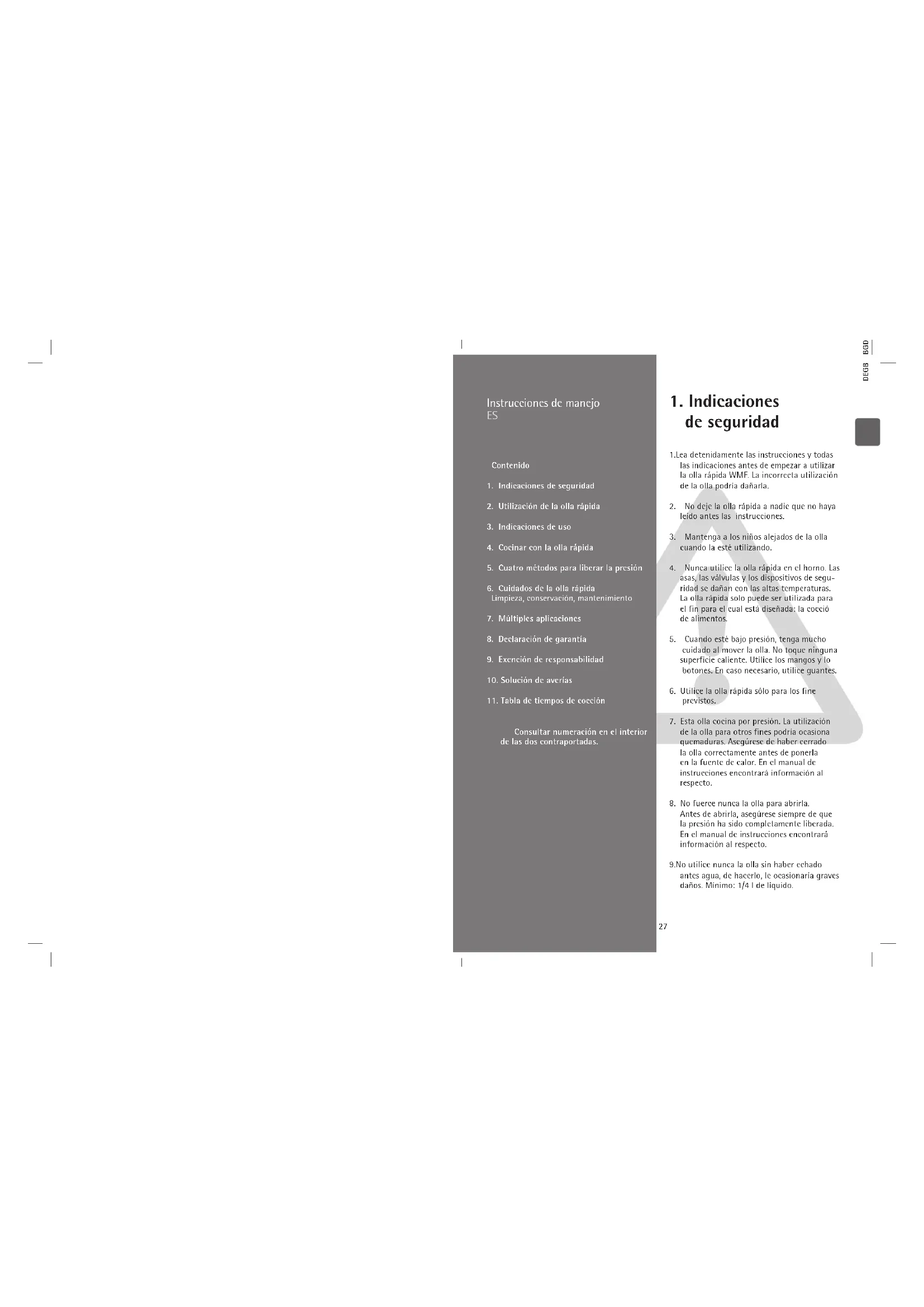 los dispositivos de seguridad, las válvulas y las juntas están en perfectas condiciones de funcionamiento. Sólo así se podrá garantizar el funcionamiento seguro de la olla. En el manual de instrucciones en- contrará información al respecto.