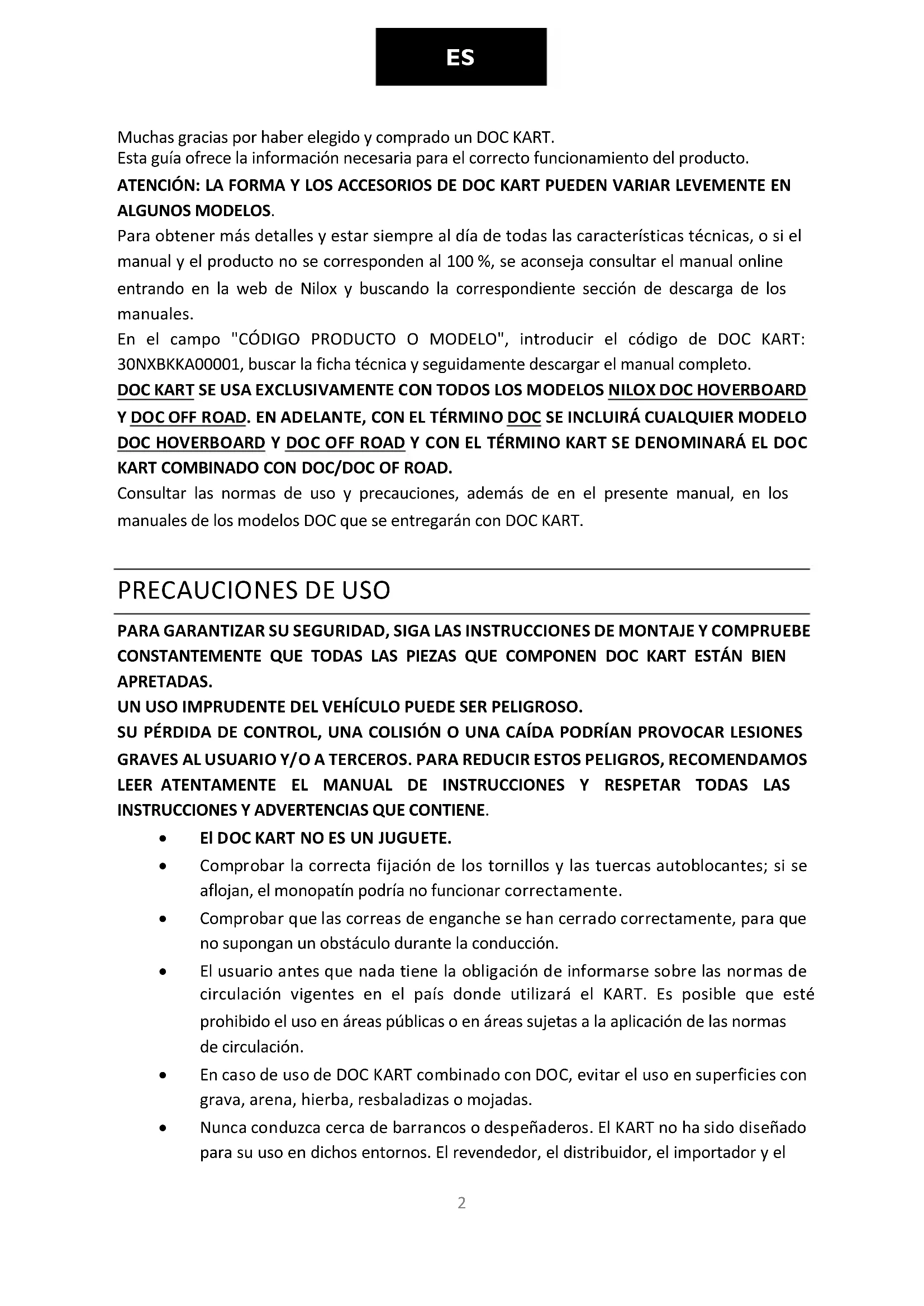 Muchas gracias por haber elegido y comprado un DOC KART. Esta guía ofrece la información necesaria para el correcto funcionamiento del producto. ATENCIÓN: LA FORMA Y LOS ACCESORIOS DE DOC KART PUEDEN VARIAR LEVEMENTE EN ALGUNOS MODELOS. Para obtener más detalles y estar siempre al día de todas las características técnicas, o si el manual y el producto no se corresponden al 100 %, se aconseja consultar el manual online entrando en la web de Nilox y buscando la correspondiente sección de descarga de los manuales. En el campo "CÓDIGO PRODUCTO O MODELO", introducir el código de DOC KART: 30NXBKKA00001, buscar la ficha técnica y seguidamente descargar el manual completo. DOC KART SE USA EXCLUSIVAMENTE CON TODOS LOS MODELOS NILOX DOC HOVERBOARD Y DOC OFF ROAD. EN ADELANTE, CON EL TÉRMINO DOC SE INCLUIRÁ CUALQUIER MODELO DOC HOVERBOARD Y DOC OFF ROAD Y CON EL TÉRMINO KART SE DENOMINARÁ EL DOC KART COMBINADO CON DOC/DOC OF ROAD. Consultar las normas de uso y precauciones, además de en el presente manual, en los manuales de los modelos DOC que se entregarán con DOC KART.