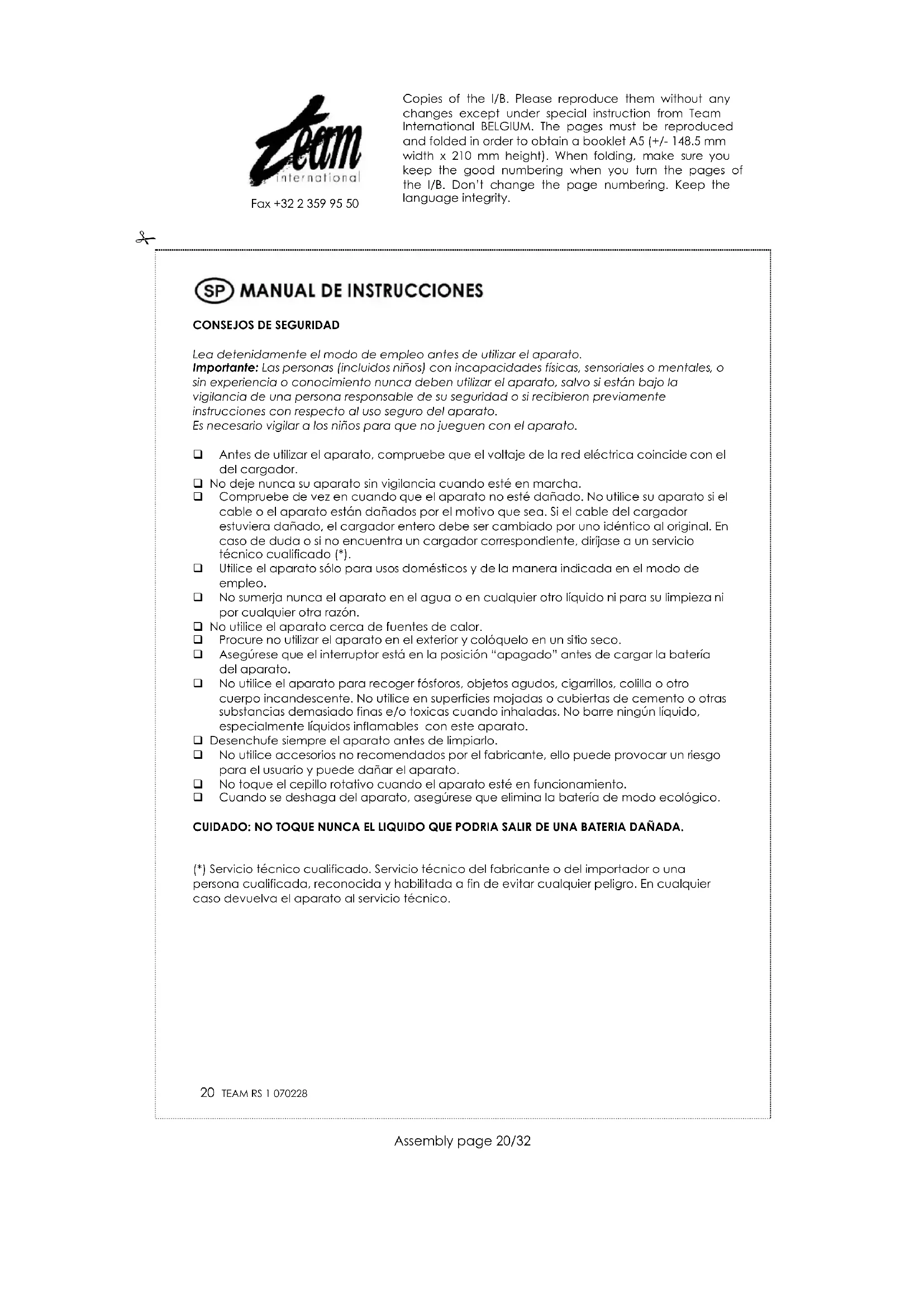 La afeitadora está equipada con una batería Ni-Cd. Cuando decida deshacerse de su aparato, quite primero la batería para proteger el medio ambiente. Para ello, vuelque el aparato y destornille la tapa del compartimiento de la batería (indicado por una cruz en la figura 6, p. 4), levántelo con un destornillador por ejemplo. Corte los hilos que juntan la batería con el aparato y saque la batería. Llévela a un contenedor ecológico creado para ello (por favor contacte con la autoridad local) o devuélvala al lugar de compra. Nunca la abandone en cualquier sitio. Guía de problemas PROBLEMA CAUSA POSIBLE SOLUCIÓN El aparato no funciona La batería está descargada La toma de corriente no fornece energía El aparato tiene que ser reparado Cargue la batería Comprueba que el fusible no fundió Contacte con el servicio técnico cualificado (*) El aparato no barra nada El recipiente para recoger el polvo está lleno La batería está descargada Vacíe el recipiente para recoger el polvo Cargue la batería El cepillo rotativo no funciona El cepillo está entupido por suciedad Quite los cabellos o la suciedad del cepillo El polvo sale del aparato El recipiente para recoger el polvo está lleno El aparato está inclinado Vacíe el recipiente para recoger el polvo Ponga el aparato en una superficie plana Copies of the I/B. Please reproduce them without any changes except under special instruction from Team International BELGIUM. The pages must be reproduced and folded in order to obtain a booklet A5 (+/- 148.5 mm width x 210 mm height). When folding, make sure you keep the good numbering when you turn the pages of the I/B. Don’t change the page numbering. Keep the language integrity. 23 TEAM RS 1 070228