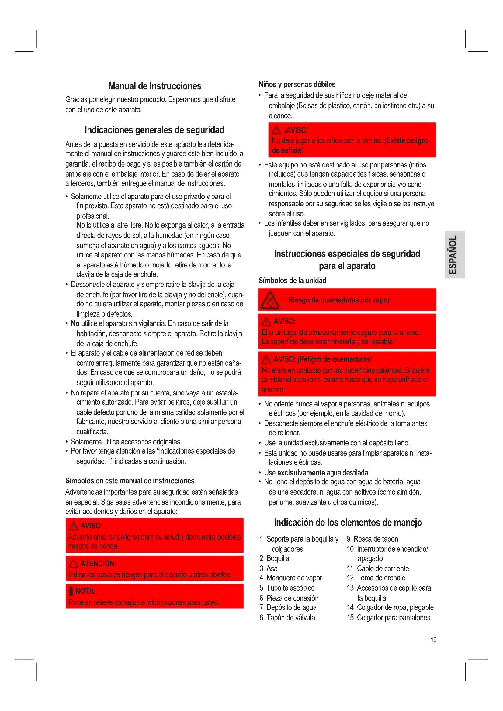 - Los infantiles deberían ser vigilados, para asegurar que no jueguen con el aparato. Instrucciones especiales de seguridad para el aparato Símbolos de la unidad Riesgo de quemaduras por vapor AVISO: Elija un lugar de almacenamiento seguro para la unidad. La supercie debe estar nivelada y ser estable. AVISO: ¡Peligro de quemaduras! No entre en contacto con las supercies calientes. Si quiere cambiar el accesorio, espere hasta que se haya enfriado el aparato.