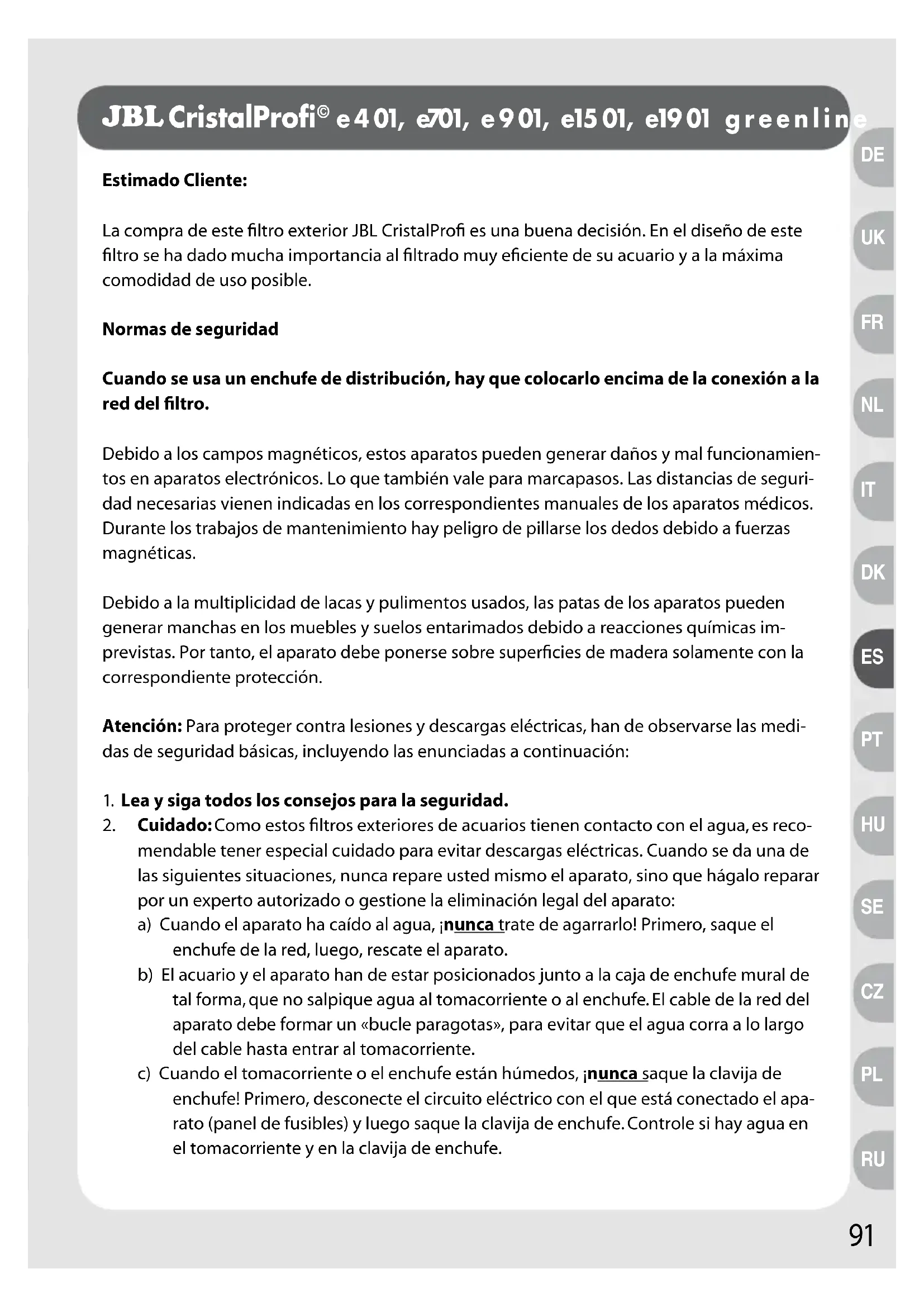 Serienr. _ _ - _ _- _ _ _ _ _ Købsdato: _ _ / _ _ / _ _ (vedlæg venligst kvitteringen, som bliver returneret sammen med apparatet) Grunden til reklamation: Dato:................................................ Underskrift:................................................ Plads til kvittering:91 Estimado Cliente:La compra de este filtro exterior JBL CristalProfi es una buena decisión. En el diseño de este filtro se ha dado mucha importancia al filtrado muy eficiente de su acuario y a la máxima comodidad de uso posible.Normas de seguridadCuando se usa un enchufe de distribución, hay que colocarlo encima de la conexión a la red del filtro.Debido a los campos magnéticos, estos aparatos pueden generar daños y mal funcionamien-tos en aparatos electrónicos. Lo que también vale para marcapasos. Las distancias de seguri-dad necesarias vienen indicadas en los correspondientes manuales de los aparatos médicos.Durante los trabajos de mantenimiento hay peligro de pillarse los dedos debido a fuerzas magnéticas.Debido a la multiplicidad de lacas y pulimentos usados, las patas de los aparatos pueden generar manchas en los muebles y suelos entarimados debido a reacciones químicas im-previstas. Por tanto, el aparato debe ponerse sobre superficies de madera solamente con la correspondiente protección.Atención: Para proteger contra lesiones y descargas eléctricas, han de observarse las medi-das de seguridad básicas, incluyendo las enunciadas a continuación:1. Lea y siga todos los consejos para la seguridad.
