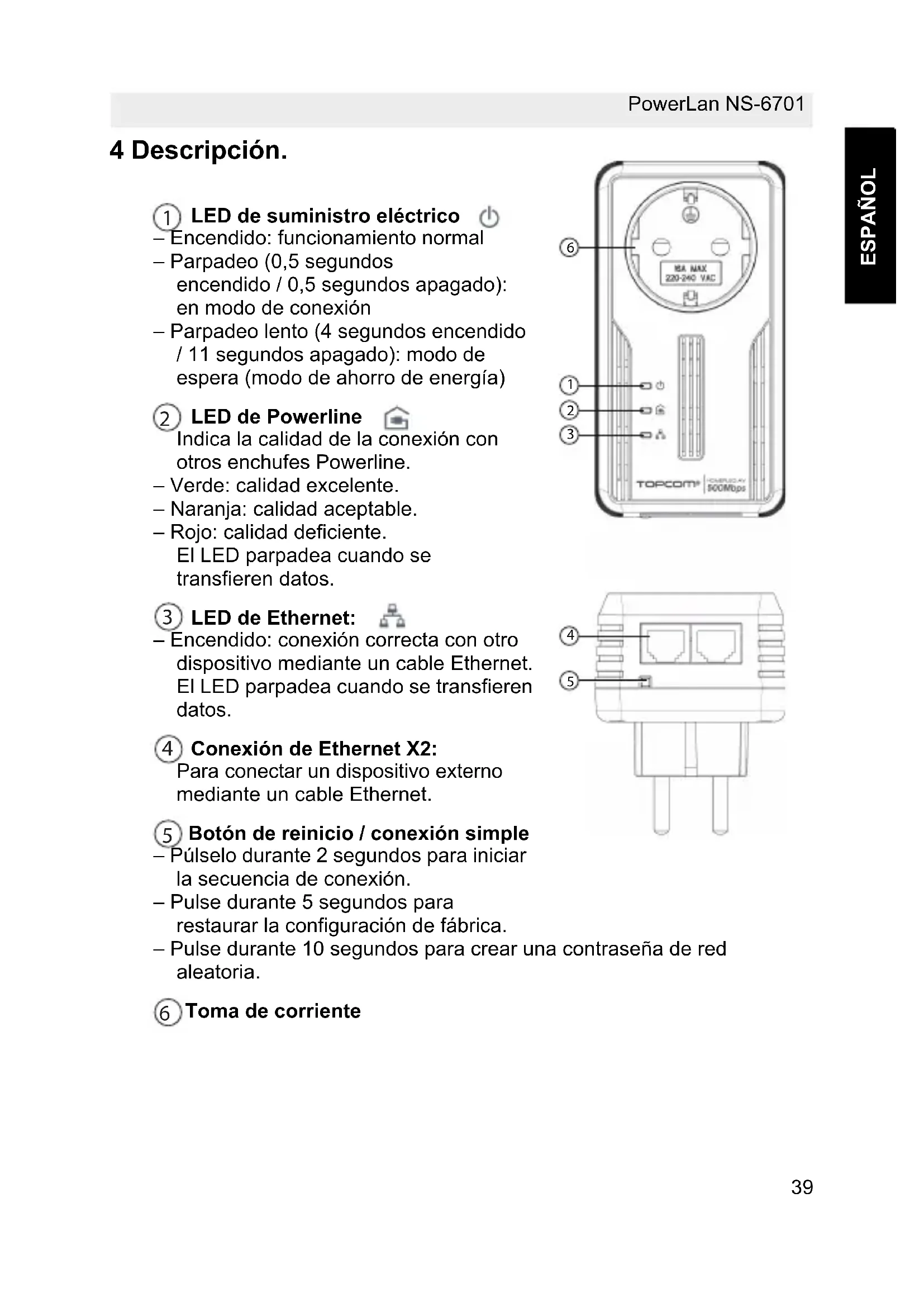 ESPAÑOL 4 Descripción. LED de suministro eléctrico – Encendido: funcionamiento normal – Parpadeo (0,5 segundos encendido / 0,5 segundos apagado): en modo de conexión – Parpadeo lento (4 segundos encendido / 11 segundos apagado): modo de espera (modo de ahorro de energía) LED de Powerline Indica la calidad de la conexión con otros enchufes Powerline. – Verde: calidad excelente. – Naranja: calidad aceptable. – Rojo: calidad deficiente. El LED parpadea cuando se transfieren datos. LED de Ethernet: – Encendido: conexión correcta con otro dispositivo mediante un cable Ethernet. El LED parpadea cuando se transfieren datos. Conexión de Ethernet X2: Para conectar un dispositivo externo mediante un cable Ethernet. Botón de reinicio / conexión simple – Púlselo durante 2 segundos para iniciar la secuencia de conexión. – Pulse durante 5 segundos para restaurar la configuración de fábrica. – Pulse durante 10 segundos para crear una contraseña de red aleatoria. Toma de corriente