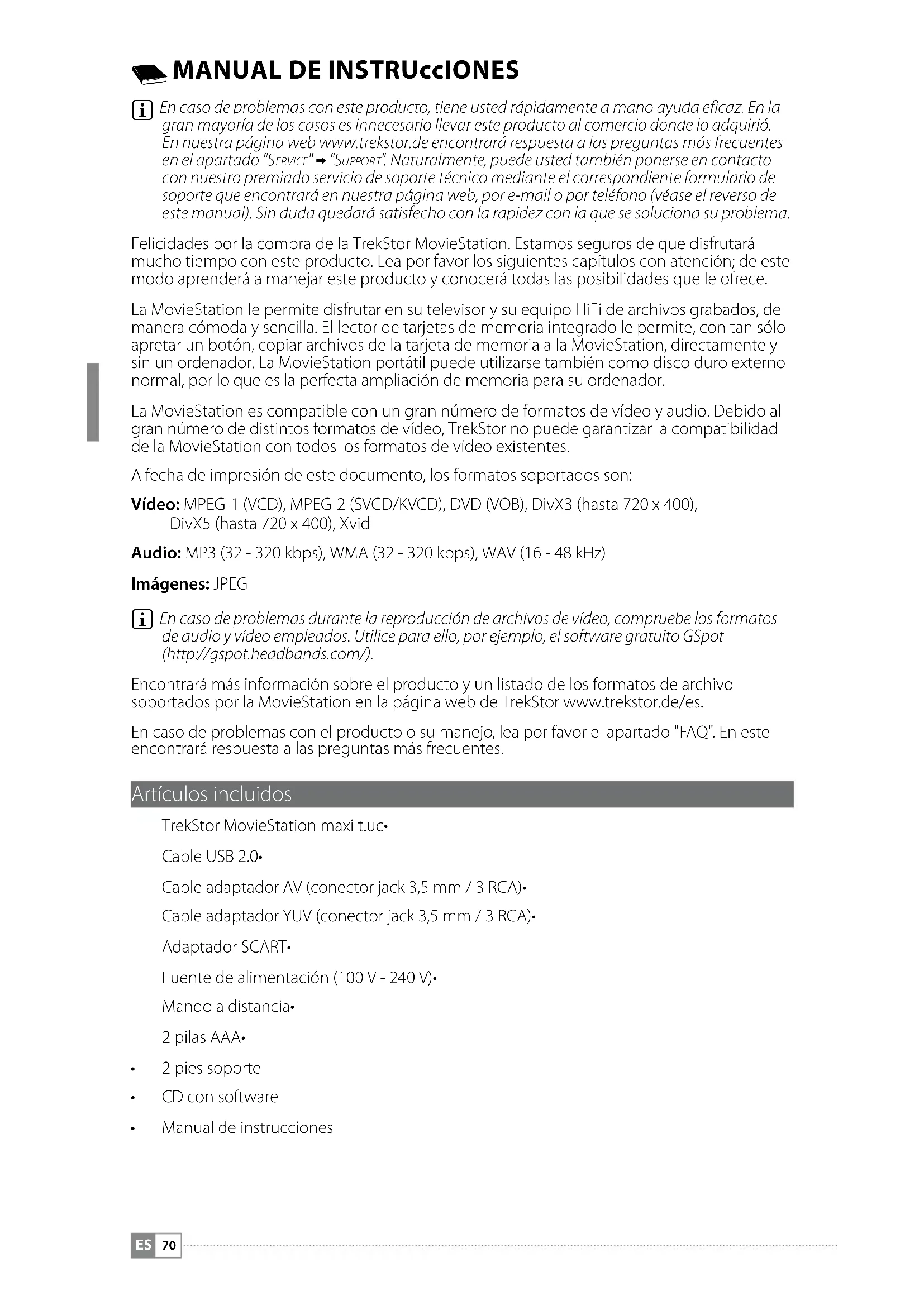 En caso de problemas durante la reproducción de archivos de vídeo, compruebe los formatos de audio y vídeo empleados. Utilice para ello, por ejemplo, el software gratuito GSpot (http://gspot.headbands.com/). Encontrará más información sobre el producto y un listado de los formatos de archivo soportados por la MovieStation en la página web de TrekStor www.trekstor.de/es. En caso de problemas con el producto o su manejo, lea por favor el apartado "FAQ". En este encontrará respuesta a las preguntas más frecuentes. Artículos incluidos TrekStor MovieStation maxi t.uc• Cable USB 2.0• Cable adaptador AV (conector jack 3,5 mm / 3 RCA)• Cable adaptador YUV (conector jack 3,5 mm / 3 RCA)• Adaptador SCART• Fuente de alimentación (100 V - 240 V)• Mando a distancia• 2 pilas AAA• 2 pies soporte• CD con software• Manual de instrucciones•ES