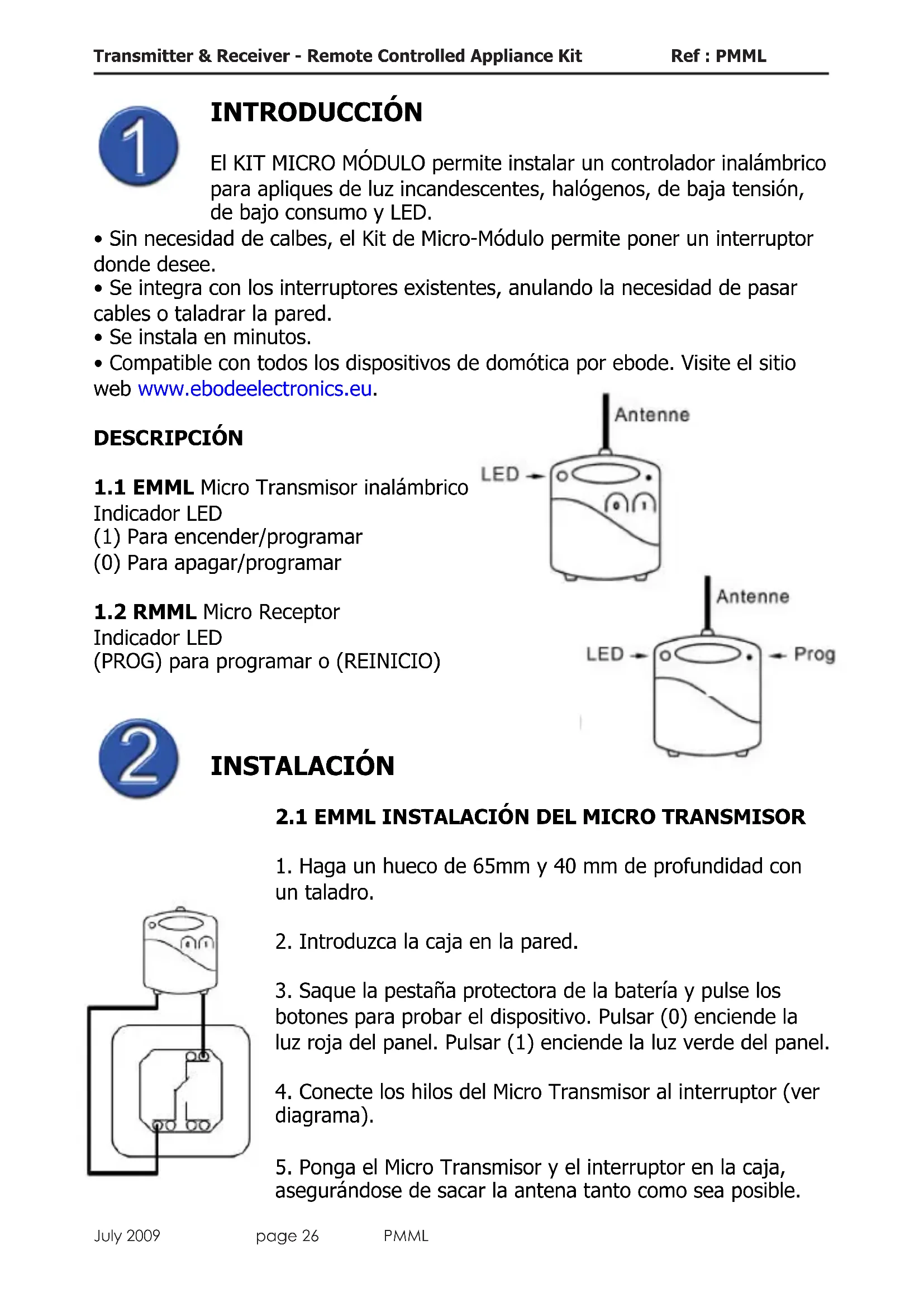ACTIVACIÓN Cuando se hayan instalado los Micro Módulos, conecte el conmutador del circuito. Compruebe el funcionamiento pulsando el botón de encendido/apagado del conmutador. La instalación ha nalizado. Punto de luz Antena Cable activo Cable neutro N N L L N N L L Antena Toma de alimentación Cable activo Cable neutro Neutro 230V - 50 Hz Activo 230V - 50 Hz Neutro 230V - 50 Hz Activo 230V - 50 Hz Cable de tierraTransmitter & Receiver - Remote Controlled Appliance Kit Ref : PMML July 2009 page 28 PMML