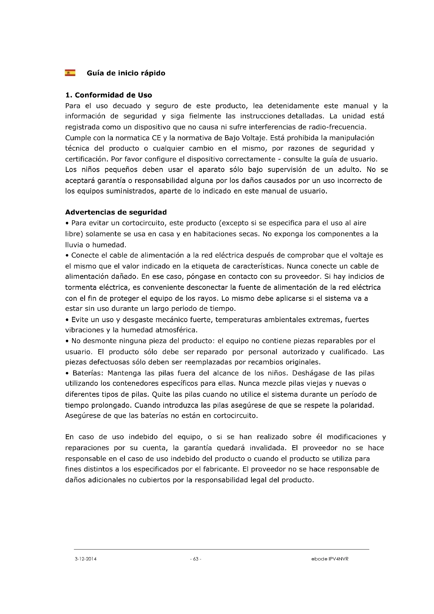 - Baterías: Mantenga las pilas fuera del alcance de los niños. Deshágase de las pilas utilizando los contenedores específicos para ellas. Nunca mezcle pilas viejas y nuevas o diferentes tipos de pilas. Quite las pilas cuando no utilice el sistema durante un período de tiempo prolongado. Cuando introduzca las pilas asegúrese de que se respete la polaridad. Asegúrese de que las baterías no están en cortocircuito. En caso de uso indebido del equipo, o si se han realizado sobre él modificaciones y reparaciones por su cuenta, la garantía quedará invalidada. El proveedor no se hace responsable en el caso de uso indebido del producto o cuando el producto se utiliza para fines distintos a los especificados por el fabricante. El proveedor no se hace responsable de daños adicionales no cubiertos por la responsabilidad legal del producto.3-12-2014 - 64 - ebode IPV4NVR