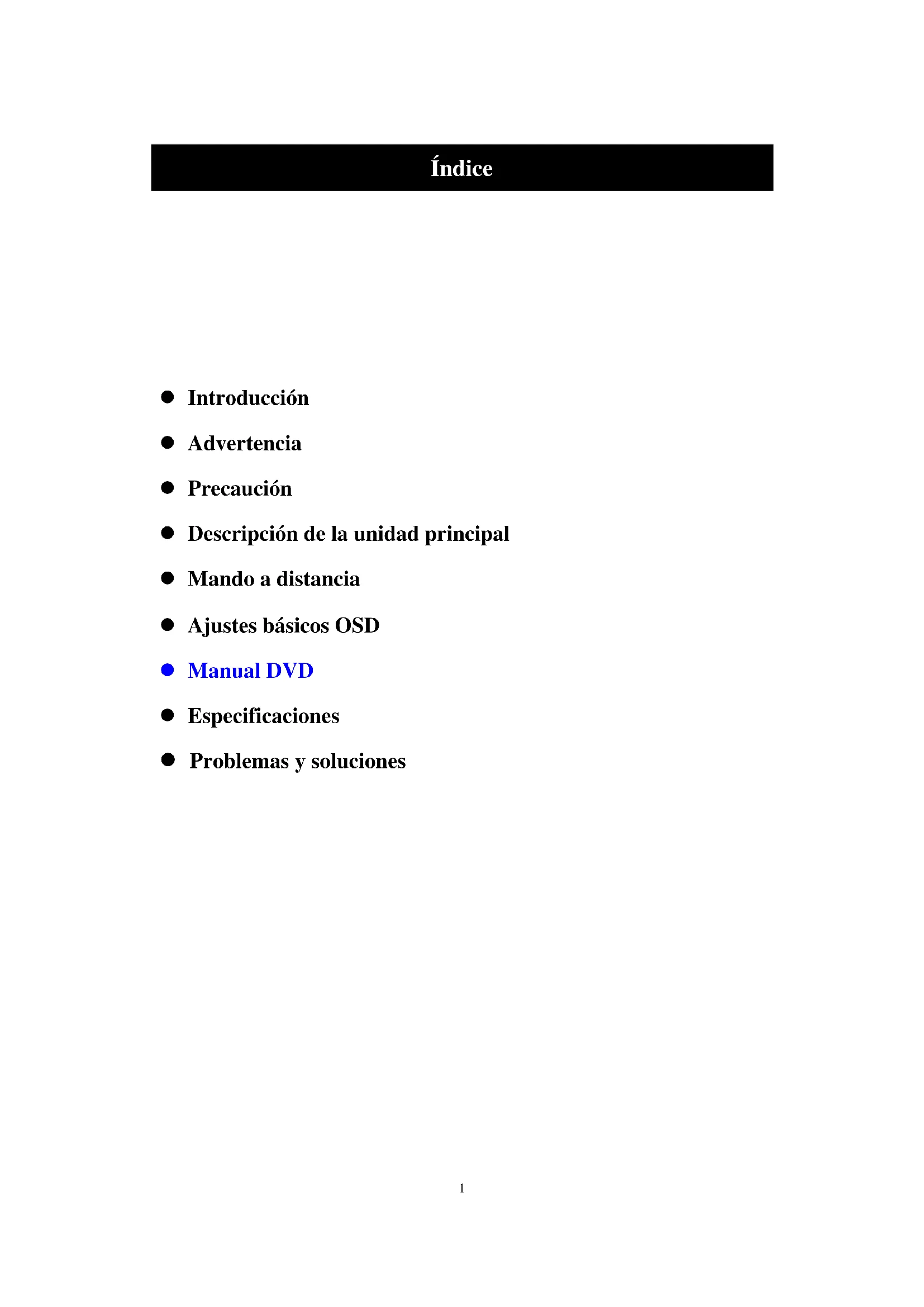 z Introducción z Advertencia z Precaución z Descripción de la unidad principal z Mando a distancia z Ajustes básicos OSD z Manual DVD z Especificaciones z Problemas y soluciones2 Introducción Muchas gracias por su compra de nuestro producto, la TV LCD. Sirve como TV normal a color y monitor PC. Para disfrutar por completo de su unidad desde el principio, lea este manual con detenimiento y consérvelo a la mano para poder consultarlo fácilmente.