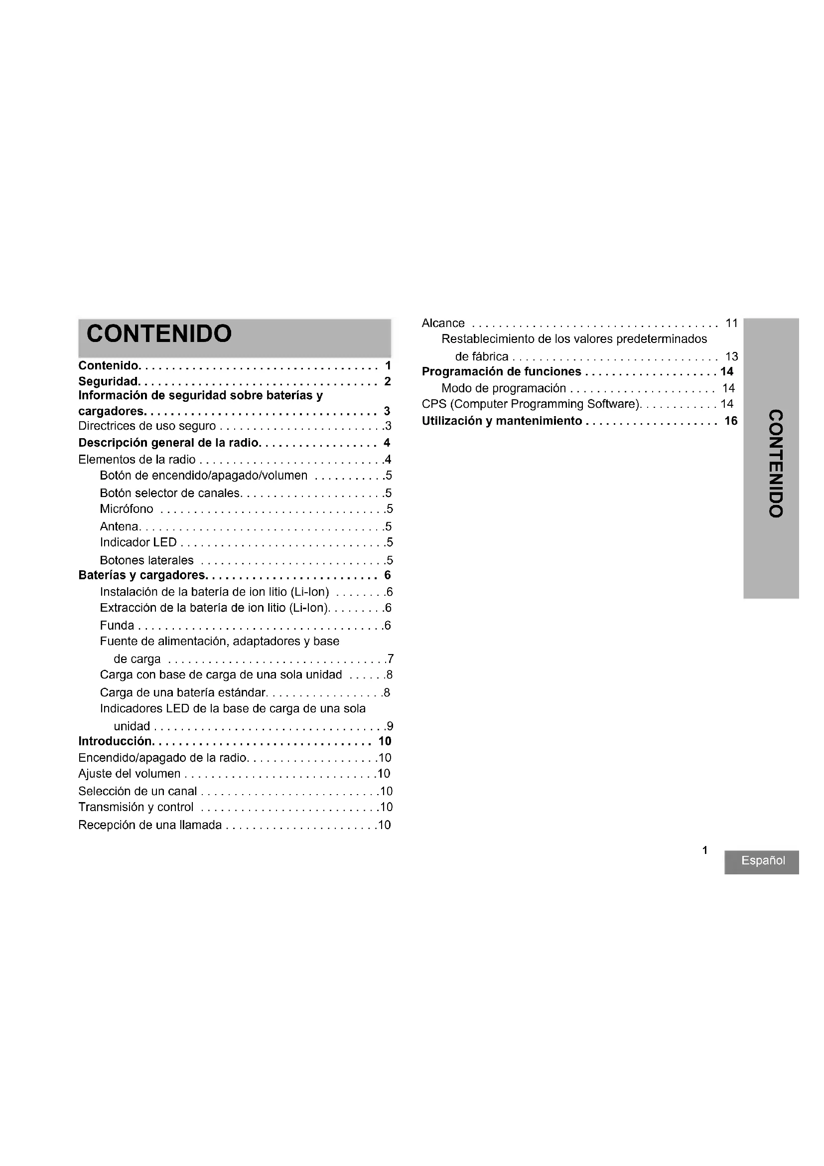 FUNCIONES También proporciona seguridad dado que permite configurar una contraseña para la gestión del perfil de la radio. Consulte todos los detalles en el apartado de tabla de resumen de características del final de la guía del usuario. Nota: Las funciones las debe activar un distribuidor autorizado de Motorola. Consulte todos los detalles en su punto de venta Motorola. Nota: (*) El cable de programación CPS es un accesorio que se vende por separado. Para obtener información sobre el número de pieza, consulte la sección de accesorios. Consulte en el CD de CPS la información detallada sobre CPS.Español