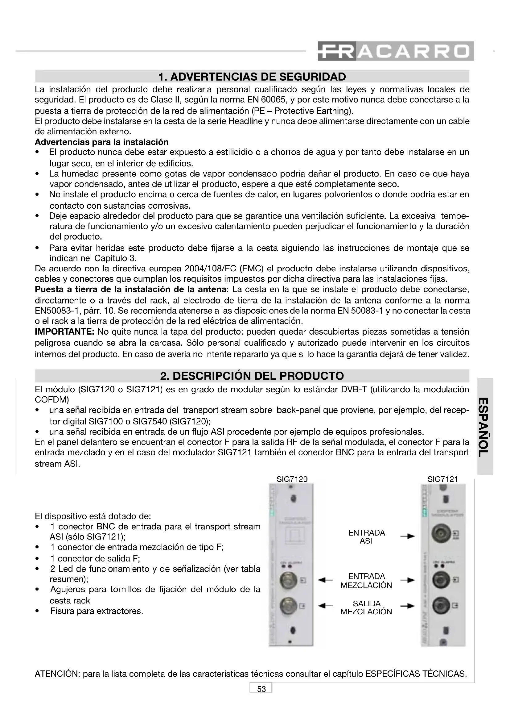 - Fisura para extractores. ATENCIÓN: para la lista completa de las características técnicas consultar el capítulo ESPECÍFICAS TÉCNICAS. ENTRADA ASI ENTRADA MEZCLACIÓN SALIDA MEZCLACIÓN SIG7120 SIG712154 ESPAÑOL
