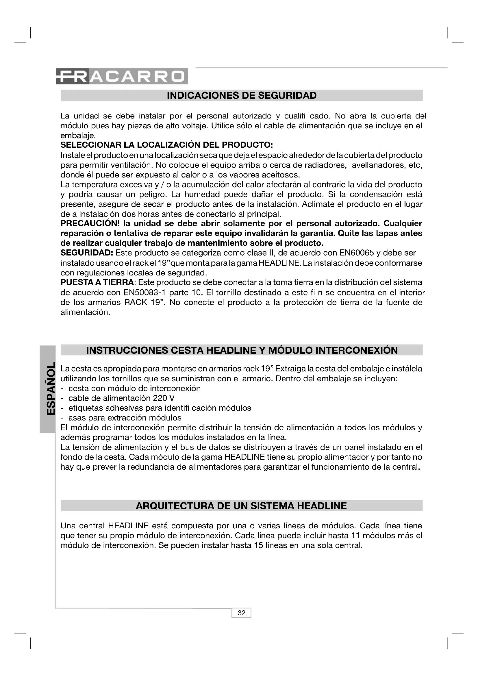 La unidad se debe instalar por el personal autorizado y cualifi cado. No abra la cubierta del módulo pues hay piezas de alto voltaje. Utilice sólo el cable de alimentación que se incluye en el embalaje. SELECCIONAR LA LOCALIZACIÓN DEL PRODUCTO: Instale el producto en una localización seca que deja el espacio alrededor de la cubierta del producto para permitir ventilación. No coloque el equipo arriba o cerca de radiadores, avellanadores, etc, donde él puede ser expuesto al calor o a los vapores aceitosos. La temperatura excesiva y / o la acumulación del calor afectarán al contrario la vida del producto y podría causar un peligro. La humedad puede dañar el producto. Si la condensación está presente, asegure de secar el producto antes de la instalación. Aclimate el producto en el lugar de a instalación dos horas antes de conectarlo al principal. PRECAUCIÓN! la unidad se debe abrir solamente por el personal autorizado. Cualquier reparación o tentativa de reparar este equipo invalidarán la garantía. Quite las tapas antes de realizar cualquier trabajo de mantenimiento sobre el producto. SEGURIDAD: Este producto se categoriza como clase II, de acuerdo con EN60065 y debe ser instalado usando el rack el 19”que monta para la gama HEADLINE. La instalación debe conformarse con regulaciones locales de seguridad. PUESTA A TIERRA: Este producto se debe conectar a la toma tierra en la distribución del sistema de acuerdo con EN50083-1 parte 10. El tornillo destinado a este fi n se encuentra en el interior de los armarios RACK 19”. No conecte el producto a la protección de tierra de la fuente de alimentación. INSTRUCCIONES CESTA HEADLINE Y MÓDULO INTERCONEXIÓN La cesta es apropiada para montarse en armarios rack 19” Extraiga la cesta del embalaje e instálela utilizando los tornillos que se suministran con el armario. Dentro del embalaje se incluyen: - cesta con módulo de interconexión - cable de alimentación 220 V - etiquetas adhesivas para identifi cación módulos - asas para extracción módulos El módulo de interconexión permite distribuir la tensión de alimentación a todos los módulos y además programar todos los módulos instalados en la línea. La tensión de alimentación y el bus de datos se distribuyen a través de un panel instalado en el fondo de la cesta. Cada módulo de la gama HEADLINE tiene su propio alimentador y por tanto no hay que prever la redundancia de alimentadores para garantizar el funcionamiento de la central.