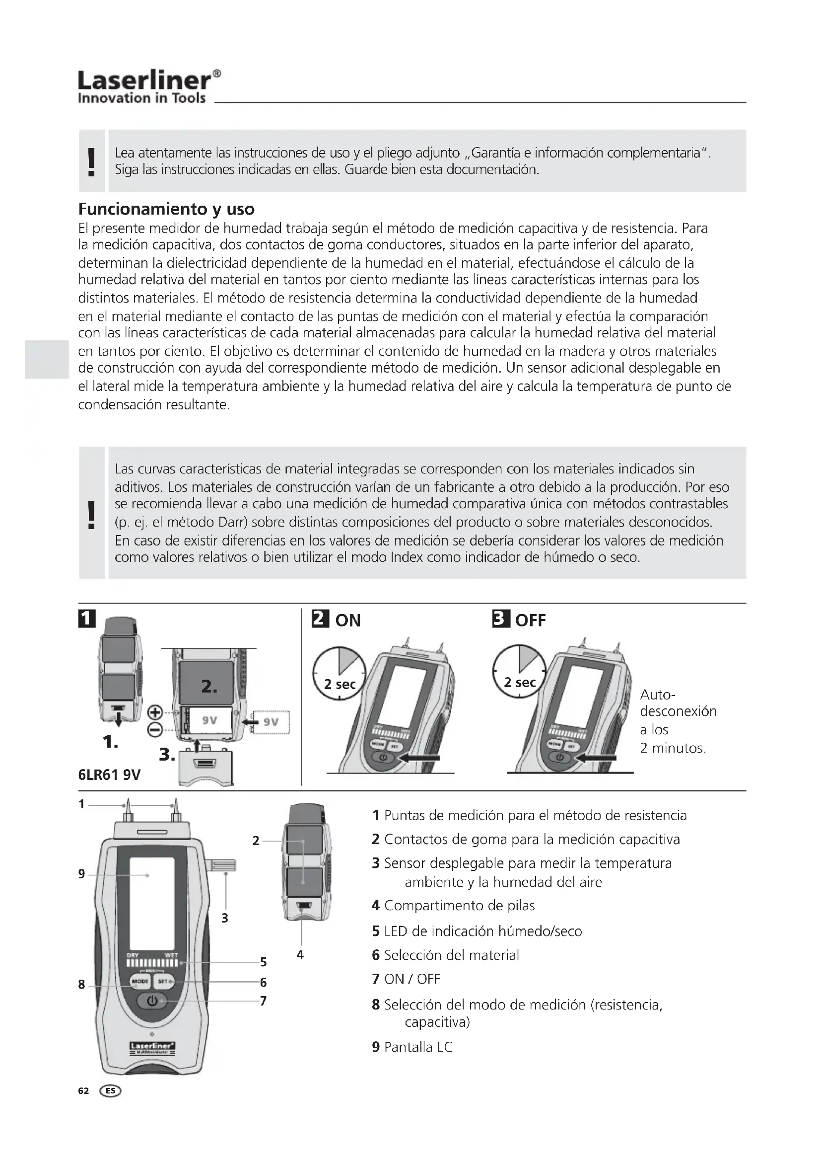 Funcionamiento y uso El presente medidor de humedad trabaja según el método de medición capacitiva y de resistencia. Para la medición capacitiva, dos contactos de goma conductores, situados en la parte inferior del aparato, determinan la dielectricidad dependiente de la humedad en el material, efectuándose el cálculo de la humedad relativa del material en tantos por ciento mediante las líneas características internas para los distintos materiales. El método de resistencia determina la conductividad dependiente de la humedad en el material mediante el contacto de las puntas de medición con el material y efectúa la comparación con las líneas características de cada material almacenadas para calcular la humedad relativa del material en tantos por ciento. El objetivo es determinar el contenido de humedad en la madera y otros materiales de construcción con ayuda del correspondiente método de medición. Un sensor adicional desplegable en el lateral mide la temperatura ambiente y la humedad relativa del aire y calcula la temperatura de punto de condensación resultante. Lea atentamente las instrucciones de uso y el pliego adjunto „Garantía e información complementaria“. Siga las instrucciones indicadas en ellas. Guarde bien esta documentación.