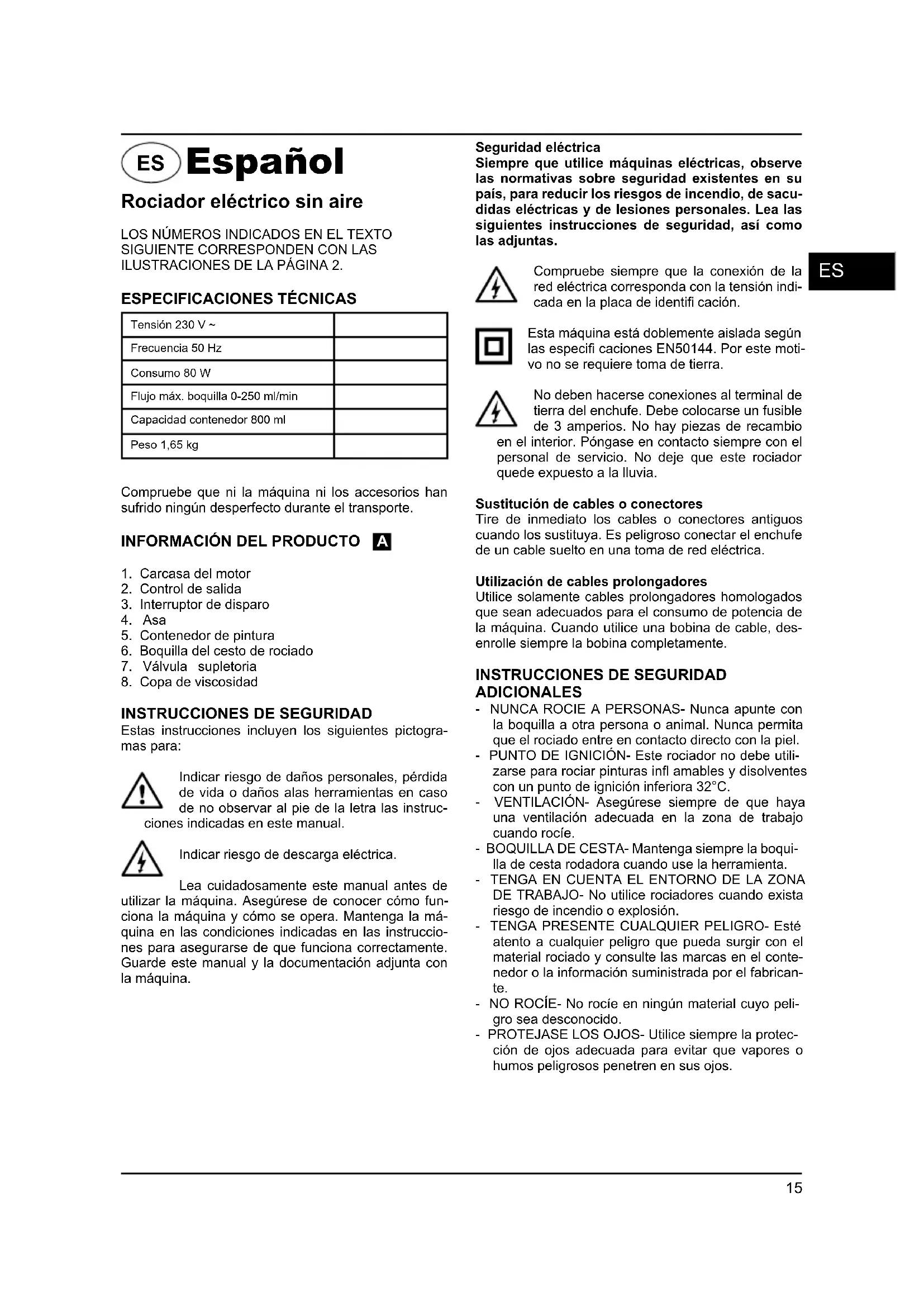 Estas instrucciones incluyen los siguientes pictogra- mas para: Indicar riesgo de daños personales, pérdida de vida o daños alas herramientas en caso de no observar al pie de la letra las instruc- ciones indicadas en este manual. Indicar riesgo de descarga eléctrica. Lea cuidadosamente este manual antes de utilizar la máquina. Asegúrese de conocer cómo fun- ciona la máquina y cómo se opera. Mantenga la má- quina en las condiciones indicadas en las instruccio- nes para asegurarse de que funciona correctamente. Guarde este manual y la documentación adjunta con la máquina. Seguridad eléctrica Siempre que utilice máquinas eléctricas, observe las normativas sobre seguridad existentes en su país, para reducir los riesgos de incendio, de sacu- didas eléctricas y de lesiones personales. Lea las siguientes instrucciones de seguridad, así como las adjuntas. Compruebe siempre que la conexión de la red eléctrica corresponda con la tensión indi- cada en la placa de identifi cación. Esta máquina está doblemente aislada según las especifi caciones EN50144. Por este moti- vo no se requiere toma de tierra. No deben hacerse conexiones al terminal de tierra del enchufe. Debe colocarse un fusible de 3 amperios. No hay piezas de recambio en el interior. Póngase en contacto siempre con el personal de servicio. No deje que este rociador quede expuesto a la lluvia. Sustitución de cables o conectores Tire de inmediato los cables o conectores antiguos cuando los sustituya. Es peligroso conectar el enchufe de un cable suelto en una toma de red eléctrica. Utilización de cables prolongadores Utilice solamente cables prolongadores homologados que sean adecuados para el consumo de potencia de la máquina. Cuando utilice una bobina de cable, des- enrolle siempre la bobina completamente.
