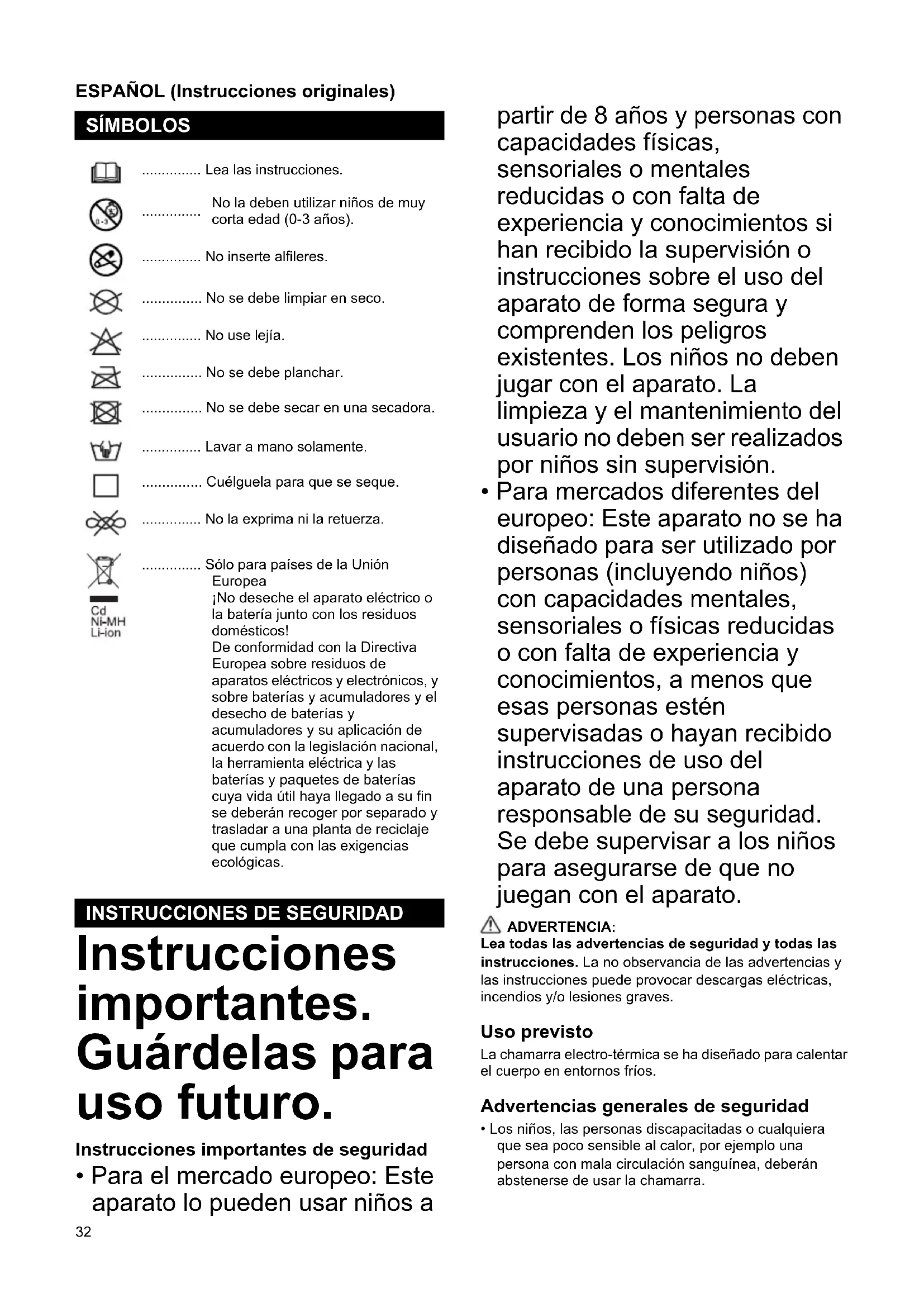 No la deben utilizar niños de muy corta edad (0-3 años). ............... No inserte alfileres. ............... No se debe limpiar en seco. ............... No use lejía. ............... No se debe planchar. ............... No se debe secar en una secadora. ............... Lavar a mano solamente. ............... Cuélguela para que se seque. ............... No la exprima ni la retuerza. ............... Sólo para países de la Unión Europea ¡No deseche el aparato eléctrico o la batería junto con los residuos domésticos! De conformidad con la Directiva Europea sobre residuos de aparatos eléctricos y electrónicos, y sobre baterías y acumuladores y el desecho de baterías y acumuladores y su aplicación de acuerdo con la legislación nacional, la herramienta eléctrica y las baterías y paquetes de baterías cuya vida útil haya llegado a su fin se deberán recoger por separado y trasladar a una planta de reciclaje que cumpla con las exigencias ecológicas.