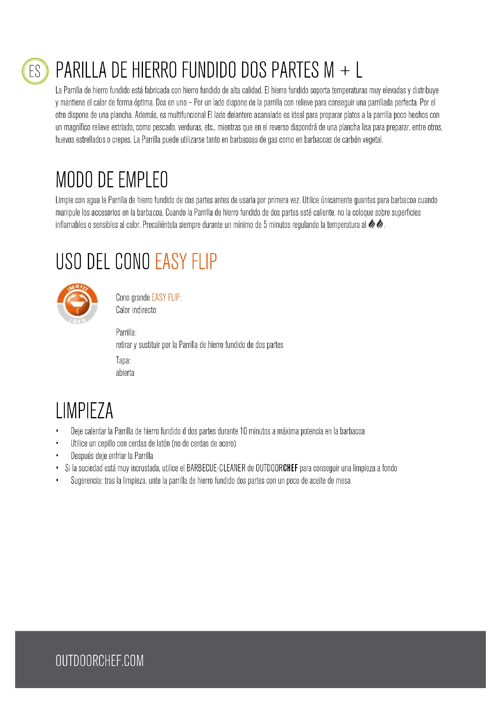 Limpie con agua la Parrilla de hierro fundido de dos partes antes de usarla por primera vez. Utilice únicamente guantes para barbacoa cuando manipule los accesorios en la barbacoa. Cuando la Parrilla de hierro fundido de dos partes esté caliente, no la coloque sobre superficies inflamables o sensibles al calor. Precaliéntela siempre durante un mínimo de 5 minutos regulando la temperatura al
