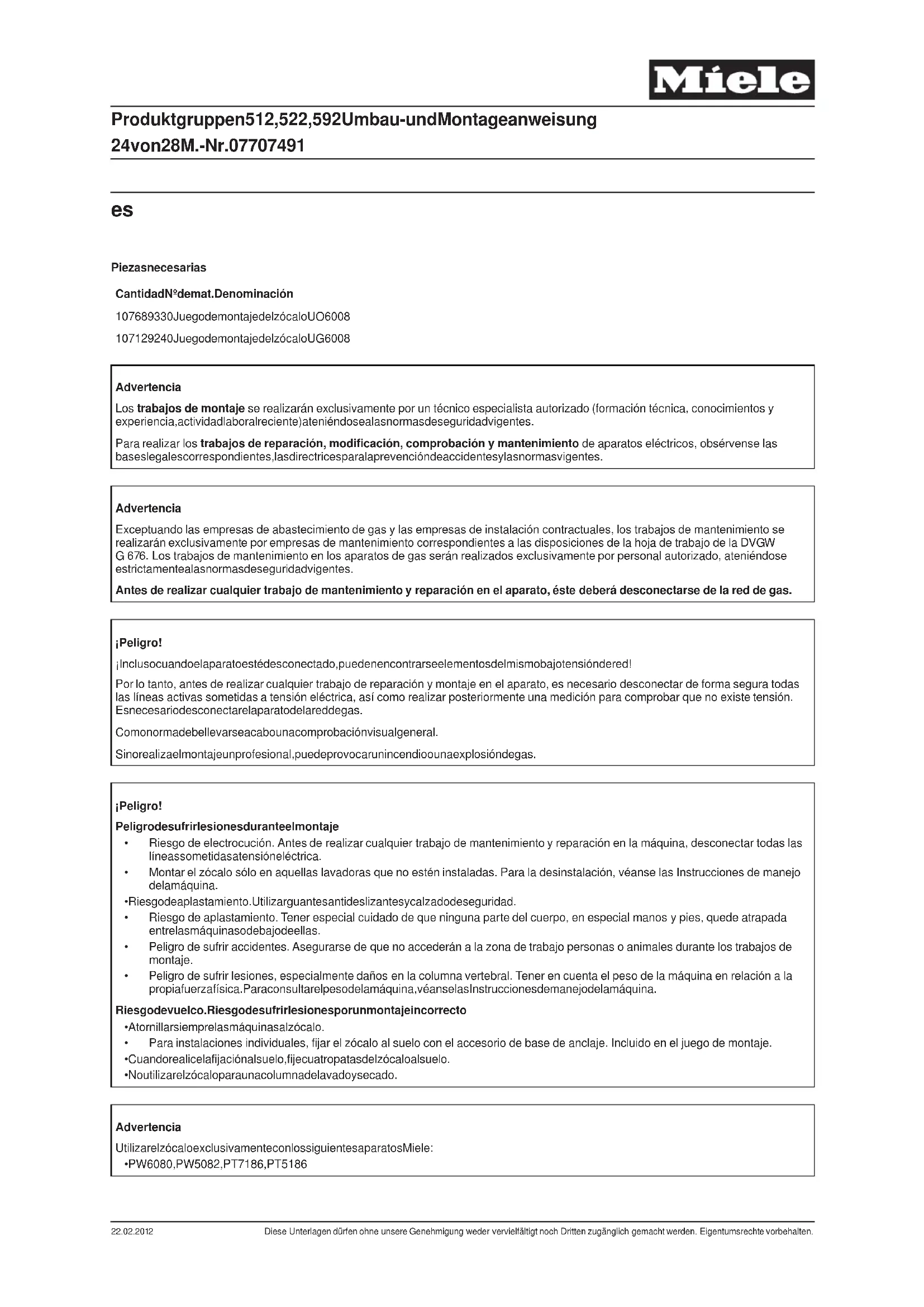 - PW 6080, PW 5082, PT 7186, PT 5186 Produktgruppen 512, 522, 592 Umbau- und Montageanweisung 24 von 28 M.-Nr. 07707491 22.02.2012 Diese Unterlagen dürfen ohne unsere Genehmigung weder vervielfältigt noch Dritten zugänglich gemacht werden. Eigentumsrechte vorbehalten.Advertencia Herramientas necesarias: