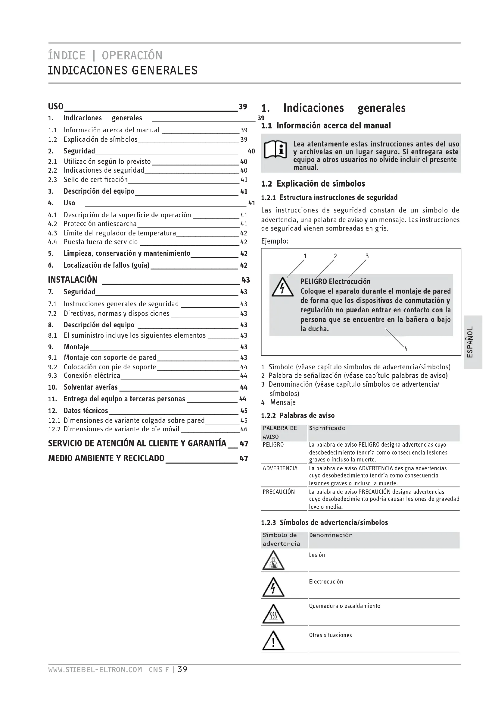 Lea atentamente estas instrucciones antes del uso y archívelas en un lugar seguro. Si entregara este equipo a otros usuarios no olvide incluir el presente manual.1.2 Explicación de símbolos1.2.1 Estructura instrucciones de seguridadLas instrucciones de seguridad constan de un símbolo de advertencia, una palabra de aviso y un mensaje. Las instrucciones de seguridad vienen sombreadas en gris.Ejemplo: PELIGRO ElectrocuciónColoque el aparato durante el montaje de pared de forma que los dispositivos de conmutación y regulación no puedan entrar en contacto con la persona que se encuentre en la bañera o bajo la ducha.