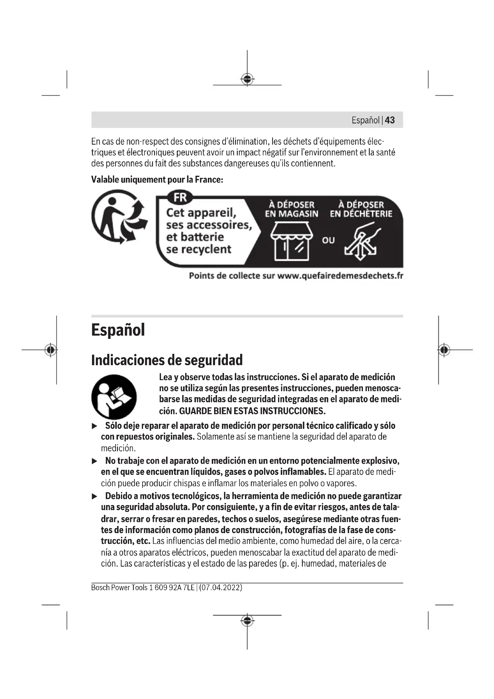 Pila 1×9V6LR61 Duración del servicio aprox. 5h Peso según EPTA‑Procedure01:2014 0,27kg Grado de protección IP 54 (protegido contra polvo y salpicaduras de agua) A) dependiente del modo de operación, material y tamaño de los objetos, así como del tipo mate- rial y estado de la base B) profundidad de detección reducida para cables sin tensión C) Sólo se produce un ensuciamiento no conductor, sin embargo ocasionalmente se espera una conductividad temporal causada por la condensación. Para la identificación unívoca de su aparato de medición sirve el número de serie(14) en la placa de características. u En caso de estado deficiente del material, la medición puede arrojar resultados erróneos en cuanto a la precisión y profundidad de detección. 1 609 92A 7LE | (07.04.2022) Bosch Power ToolsEspañol | 47 Montaje Colocar/cambiar pilas Para el funcionamiento de la herramienta de medición se recomiendan pilas alcalinas de manganeso. Para abrir la tapa del compartimiento de pilas(15) presione la retención(16) en sentido de la flecha y abra la tapa del compartimiento de las pilas. Coloque las pilas. Observe en ello la polaridad correcta conforme a la representación en el lado interior del compartimiento de pilas. u Retire las pilas del aparato de medición si no va a utilizarlo durante un periodo prolongado. Tras un tiempo de almacenaje prolongado en el aparato de medición, la pila se puede llegar a corroer y autodescargar. Indicación de pila El indicador de pilas(h) en la pantalla indica siempre el estado actual de carga de las pi- las: Indicador Capacidad 60−100% 30−60% 5−30% 0−5% Operación u Proteja el aparato de medición de la humedad y de la exposición directa al sol. u No exponga el aparato de medición a temperaturas extremas o fluctuaciones de temperatura. En el caso de fluctuaciones de temperatura grandes, deje que se enfríe antes de conectarlo. Las temperaturas extremas o los cambios bruscos de temperatura pueden afectar a la precisión del aparato de medición o a la representa- ción en el display. u Evite que el aparato de medición reciba golpes o que se caiga. Tras fuertes influjos externos y en caso de anomalías en la funcionalidad, debería dejar verificar el aparato de medición en un servicio postventa autorizado Bosch. u Por principio, los resultados de la medición pueden verse alterados por determi- nadas condiciones ambientales. Algunos de estos casos son p.ej. la proximidad de equipos que emiten campos eléctricos, magnéticos o electromagnéticos in- Bosch Power Tools 1 609 92A 7LE | (07.04.2022)48 | Español tensos, la humedad, los materiales de construcción que contienen metales, los materiales aislantes con recubrimiento de aluminio y los murales o azulejos con- ductores de corriente. Por ello, consulte también otras fuentes de información (p.ej., planos de construcción) antes de perforar, serrar o fresar en paredes, techos o suelos. u Sólo sostenga el aparato de medición por las superficies de agarre provistas (8), para no influenciar la medición. u No coloque etiquetas adhesivas o rótulos en el área del sensor(13) en el lado posterior del aparato de medición. En particular, los rótulos de metal afectan los re- sultados de medición. No use guantes durante la medición y asegúrese de una adecuada puesta a tierra. Una insuficiente puesta a tierra puede afectar a la de- tección de cables bajo tensión. Durante la medición, evite la proximidad de aparatos que emitan fuertes campos eléctricos, magnéticos o electromagnéticos. En lo posible, desactive las correspondientes funciones de todos los apara- tos cuya radiación pueda afectar la medición, o bien desconecte los aparatos. Puesta en marcha Conexión/desconexión u Asegúrese antes de conectar el aparato de medición, que el área del sensor(13) no esté húmedo. Si es necesario, seque el aparato de medición con un paño seco. u Si el aparato de medida ha sido sometido a un cambio brusco de temperatura, deje que éste se atempere primero antes de conectarlo. Para conectar el aparato de medición pulse la tecla de conexión/desconexión(5). Para desconectar el aparato de medición pulse de nuevo la tecla de conexión/ desconexión(5). Si no se presiona ninguna tecla del aparato de medición durante aprox.5minutos y no se detectan objetos, el aparato de medición se apaga automáticamente para proteger las pilas. Conexión/desconexión de la iluminación de la pantalla Con la tecla iluminación de la pantalla(6) puede conectar y desconectar la iluminación de la pantalla. 1 609 92A 7LE | (07.04.2022) Bosch Power ToolsEspañol | 49 Conexión/desconexión de la señal acústica Con la tecla señal acústica(7) podrá conectar y desconectar la señal acústica. Con la se- ñal acústica desconectada, en la pantalla aparece la indicación de señal acústica(a). Modo de funcionamiento (verfiguraB) Con el aparato de medición se examina la base del área del sensor(13) en la dirección de mediciónA hasta la máxima profundidad de medición. Se detectan objetos que difie- ren del material de la pared. Mueva el aparato de medición en línea recta en dirección B sobre la pared. Mueva siempre el aparato de medición sobre la base con una ligera presión, sin levantar- lo ni cambiar la presión de contacto. Durante la medición, los patines(12) deben estar siempre en contacto con el sustrato. Proceso de medición Coloque el aparato de medición sobre la superficie a examinar y muévalo en la direc- ciónB. – Si el aparato de medición se acerca a un objeto, la desviación en el indicador de medición(i) aumenta y el anillo luminoso(1) se ilumina en amarillo. – Si el aparato de medición se aleja del objeto, la desviación disminuye. – Sobre el centro de un objeto, el indicador de medición muestra la desviación máxima; el anillo luminoso(1) se ilumina en rojo y suena un tono de señal. En el caso de objetos pequeños o profundos, el anillo luminoso(1) puede seguir i