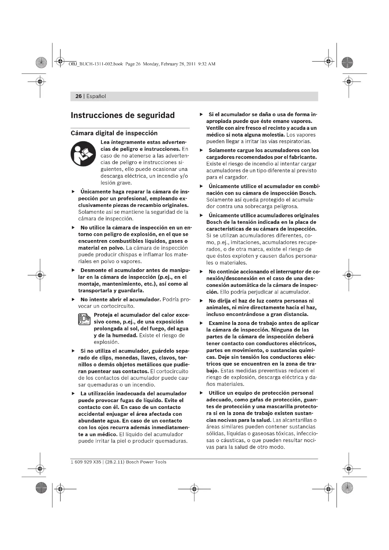 Preste atención al nº de artículo en la placa de caracte- rísticas de su cámara de inspección. Las denominacio- nes comerciales de algunas cámaras de inspección pueden variar. Indicación Capacidad >1/2 <1/2 Reserva OBJ_BUCH-1311-002.book Page 28 Monday, February 28, 2011 9:32 AMEspañol | 29 Bosch Power Tools 1 609 929 X35 | (28.2.11) Conexión del cable de la cámara (ver figura A) Para el funcionamiento de la cámara de inspec- ción es necesario conectar el cable de la cámara 6 al terminal portátil 1. Conecte el cable 6 al conector de la cámara 14 de manera que la espiga del cable penetre en el orificio del conector de la cámara según figura. Deslice el casquillo 13 del conector de la cámara sobre el conector del cable y enrósquelo en el sentido de las agujas del reloj. Para desconectar el cable de la cámara 6 desen- rosque el casquillo 13 en sentido contrario a las agujas del reloj y retire el cable de la cámara. Conexión de la extensión del cable de la cámara (accesorio especial) Para montar la extensión 12 deberá desconec- tar primero el cable de la cámara 6. Conecte entonces la extensión 12 al conector de la cámara 14 según se describe en “Conexión del cable de la cámara” y enrósquelo firmemente. Si fuese necesario puede ir empalmando más extensiones procediendo de igual manera. De- berá tenerse en cuenta que la calidad de la ima- gen empeora a partir de una longitud total 10 m de (incluyendo el cable de la cámara). Conecte el cable de la cámara 6 a la última ex- tensión 12 según se indica en “Conexión del ca- ble de la cámara”. f Asegúrese de que el cable de la cámara y las extensiones estén firmemente conectadas. Únicamente así se garantiza que sean estan- cos al agua el cable de la cámara y las exten- siones. Si las conexiones no son estancas es mayor el riesgo de exponerse a una descarga eléctrica o de dañar la cámara de inspección. Montaje del espejo, imán o gancho (ver figura B) El espejo 17, el imán 15 y el gancho 16 son ele- mentos auxiliares que pueden acoplarse al cabe- zal de la cámara 7. Presione hasta el tope en la ranura del cabezal de la cámara 7 uno de los tres elementos auxi- liares, según figura. Observación: El imán 15 y el gancho 16 sola- mente son apropiados para mover y retirar obje- tos pequeños y ligeros que no requieran aplicar gran fuerza. En caso de aplicar una fuerza exce- siva puede llegar a deteriorarse la cámara de inspección o el elemento auxiliar. Conexión de la reproducción de imagen externa (ver figura C) Ud. puede visualizar la imagen de la cámara de inspección en un monitor externo apto para re- presentar señales de vídeo NTSC estándar. Conecte el conector negro del cable de vídeo 19 que se adjunta en el conector hembra de la sali- da de vídeo 18 de la cámara de inspección. Co- necte el cable de vídeo a un monitor apropiado. Lea y aténgase a las instrucciones de uso del monitor externo. Operación f Proteja el terminal portátil 1 y el acumula- dor 10 de la humedad y de una exposición directa al sol. El cable y el cabezal de la cá- mara, así como la extensión son estancos al agua hasta una profundidad de 10 m, siem- pre que estén correctamente conectados. Sin embargo, tanto el terminal portátil como el acumulador no van protegidos contra el agua y en caso de contacto con ésta pueden provocar una descarga eléctrica o dañarse. f No exponga la cámara de inspección ni a temperaturas extremas ni a cambios brus- cos de temperatura. No la deje, p.ej., en el coche durante un largo tiempo. Si la cámara de inspección ha sufrido un cambio fuerte de temperatura, antes de ponerla en servicio, esperar primero a que se atempere. f No utilice la cámara de inspección si estu- viese empañada la lente del cabezal de la cámara 7. No conecte la cámara de inspec- ción hasta que se haya evaporado la hume- dad. En caso contrario podría deteriorarse la cámara de inspección. OBJ_BUCH-1311-002.book Page 29 Monday, February 28, 2011 9:32 AM30 | Español 1 609 929 X35 | (28.2.11) Bosch Power Tools Puesta en marcha Montar correctamente el acumulador f Solamente utilice acumuladores de iones de litio originales Bosch de la tensión indicada en la placa de características de su cámara de inspección. El uso de otro tipo de acumu- ladores puede acarrear lesiones e incluso un incendio. Observación: La utilización de acumuladores in- apropiados para su cámara de inspección puede hacer que ésta funcione incorrectamente o se deteriore. Monte el acumulador cargado 10 asentándolo hasta el tope en la empuñadura, cuidando que quede enclavado de forma perceptible. Conexión/desconexión Para conectar la cámara de inspección pulse la tecla de conexión/desconexión 3. En el display 5 se muestra la imagen captada por el cabezal de la cámara 7. Para desconectar la cámara de inspección pulse nuevamente la tecla de conexión/desconexión 3. Con el fin de proteger el acumulador, la cámara de inspección se desconecta automáticamente si no se pulsa ninguna tecla durante aprox. 20 min. Ajuste de la lámpara en el cabezal de la cámara Para obtener una imagen más clara en el display 5 Ud. puede conectar la lámpara 9 del cabezal de la cámara y regular su intensidad de iluminación. Para conectar la lámpara 9 y para aumentar la luz presione el botón “+” 2 tantas veces como sea necesario hasta alcanzar la luminosidad deseada. f No mire directamente hacia la lámpara 9 ni tampoco la dirija contra otras personas. La luz de la lámpara puede deslumbrar la vista. Para desconectar la lámpara 9 y para disminuir la luz presione el botón “–” 4 tantas veces como sea necesario hasta alcanzar la luminosidad de- seada o apagar la lámpara. Instrucciones para la operación Examine el entorno que desee inspeccionar y preste especial atención a los obstáculos y pun- tos de peligro existentes. Doble el cable de la cámara 6 de manera que su cabezal pueda introducirse con facilid