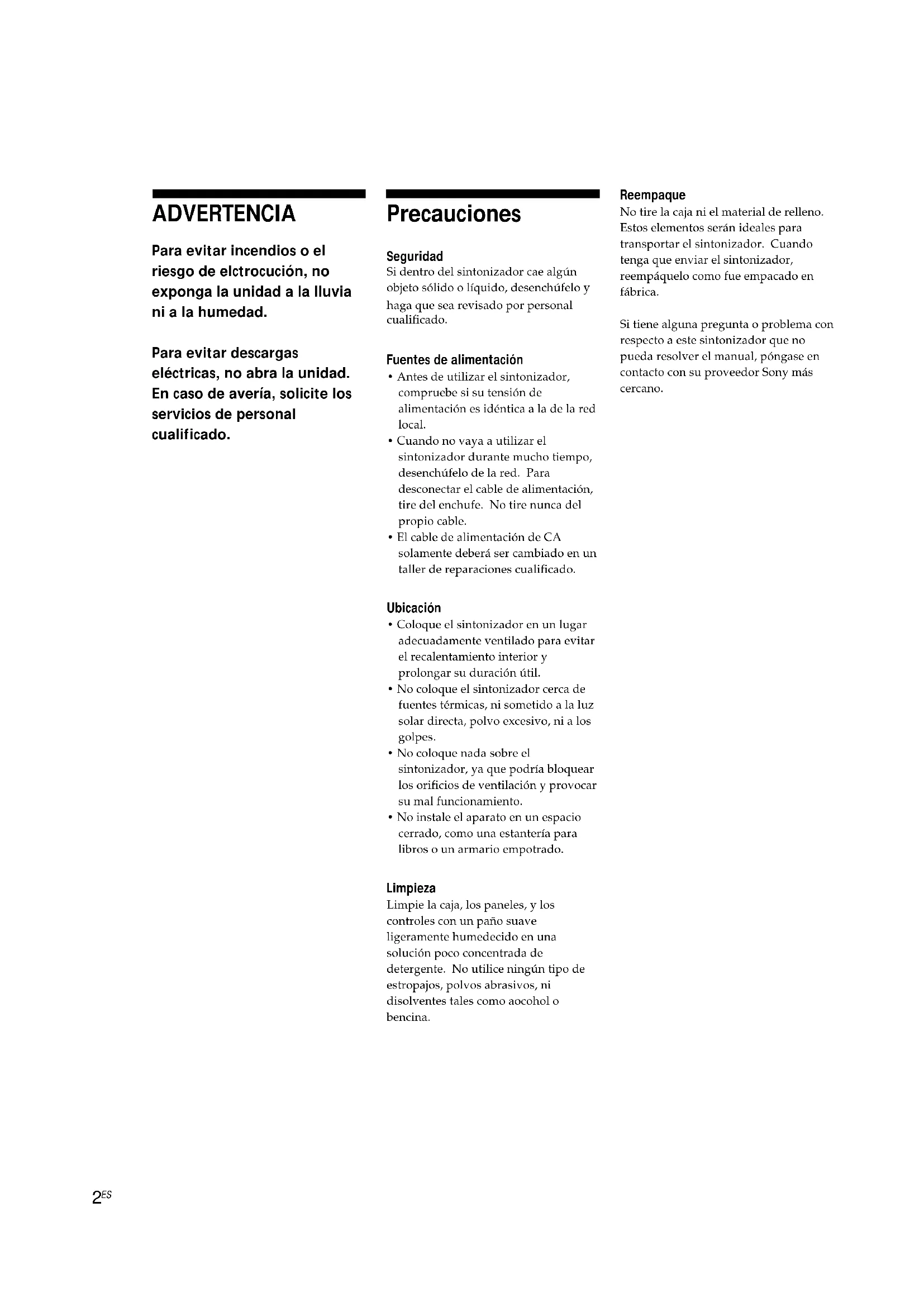 - No instale el aparato en un espacio cerrado, como una estantería para libros o un armario empotrado. Limpieza Limpie la caja, los paneles, y los controles con un paño suave ligeramente humedecido en una solución poco concentrada de detergente. No utilice ningún tipo de estropajos, polvos abrasivos, ni disolventes tales como aocohol o bencina. Reempaque No tire la caja ni el material de relleno. Estos elementos serán ideales para transportar el sintonizador. Cuando tenga que enviar el sintonizador, reempáquelo como fue empacado en fábrica. Si tiene alguna pregunta o problema con respecto a este sintonizador que no pueda resolver el manual, póngase en contacto con su proveedor Sony más cercano.3