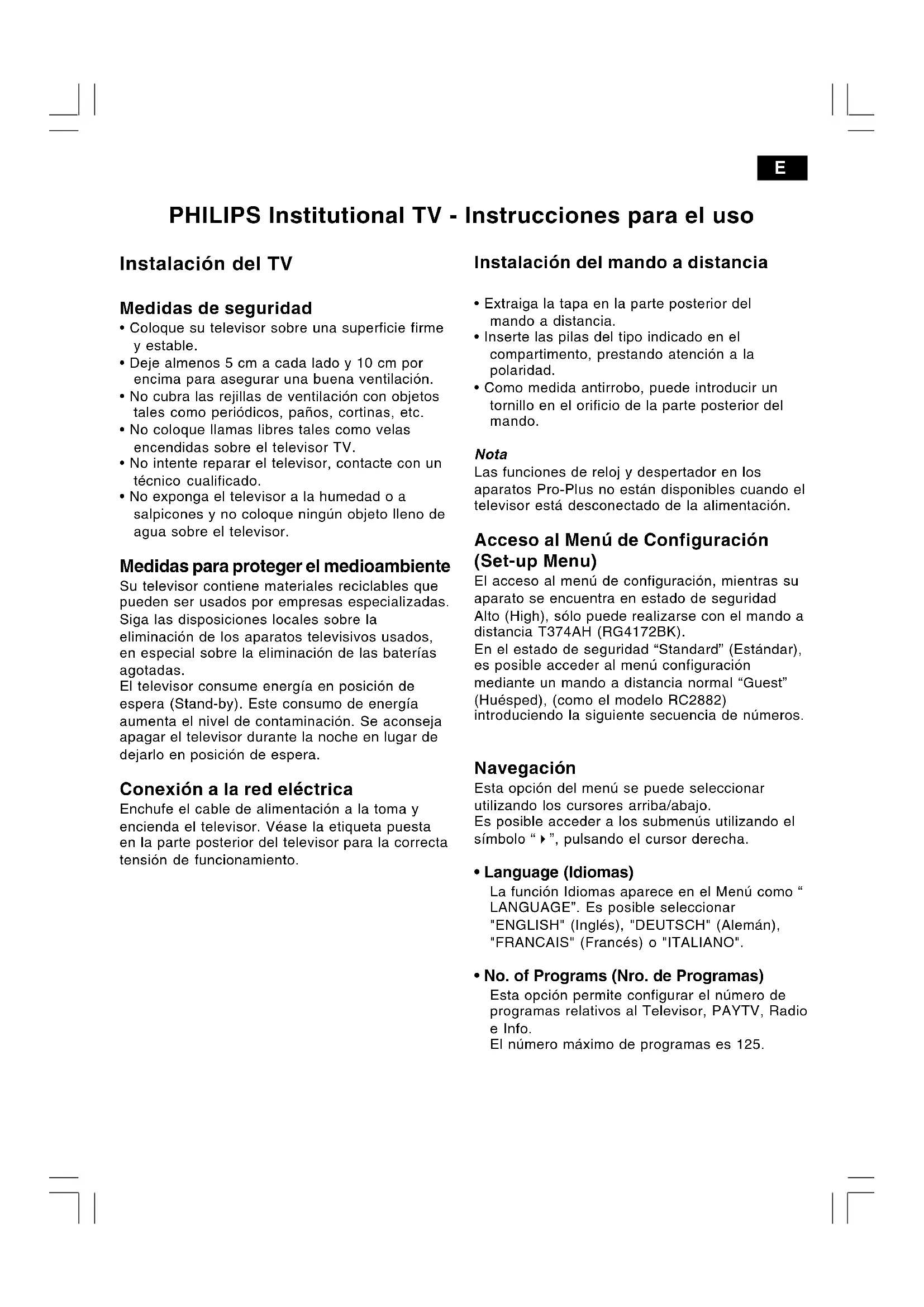- Security The menu function "SECURITY" allows the user to select one of two states "HIGH" or "STAND- ARD". The default is "STANDARD". While the set is in the Security High Mode the set- up menu can only be accessed by a T374AH Institutional Set-up Remote Control While the set is in the Security Standard Mode the Set-up Menu may be accessed with a guest remote control by a sequence of commands.E PHILIPS Institutional TV - Instrucciones para el uso Instalación del TV Medidas de seguridad