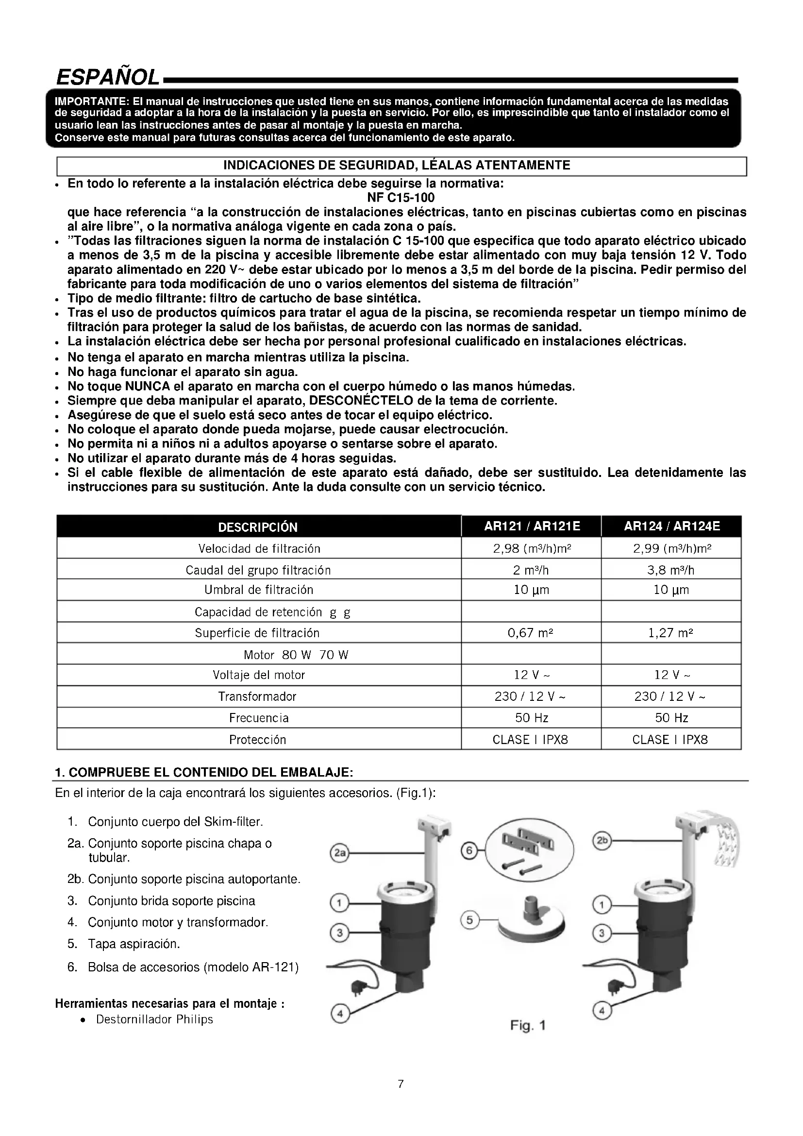 DESCRIPCIÓN AR121 / AR121E AR124 / AR124E Velocidad de filtración 2,98 (m³/h)m² 2,99 (m³/h)m² Caudal del grupo filtración 2 m³/h 3,8 m³/h Umbral de filtración 10 µm 10 µm Capacidad de retención g g Superficie de filtración 0,67 m² 1,27 m² Motor 80 W 70 W Voltaje del motor 12 V ~ 12 V ~ Transformador 230 / 12 V ~ 230 / 12 V ~ Frecuencia 50 Hz 50 Hz Protección CLASE I IPX8 CLASE I IPX8