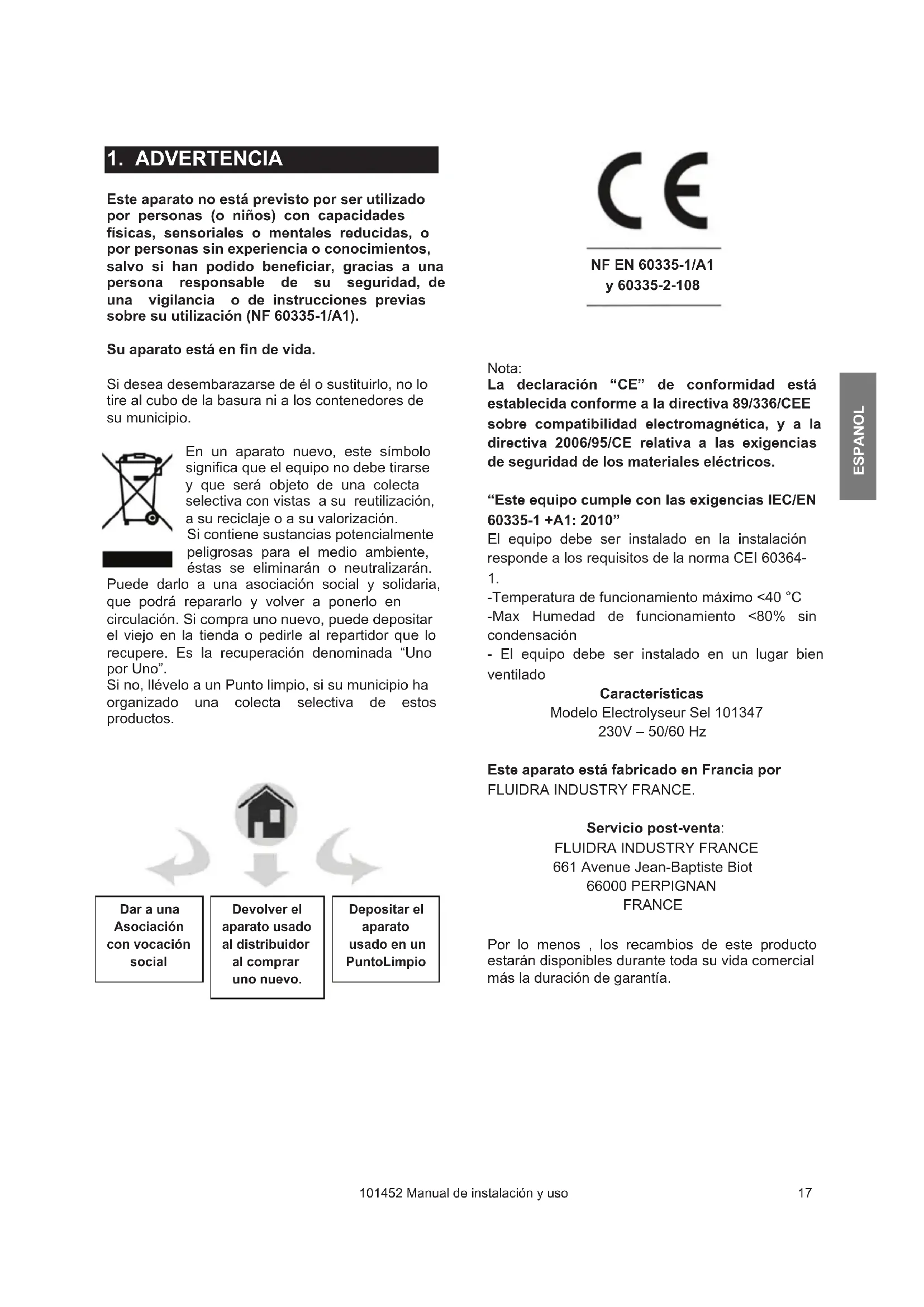661 Avenue Jean-Baptiste Biot 66000 PERPIGNAN FRANCE Por lo menos , los recambios de este producto estarán disponibles durante toda su vida comercial más la duración de garantía. Dar a una Asociación con vocación social Devolver el aparato usado al distribuidor al comprar uno nuevo. Depositar el aparato usado en un PuntoLimpio NF EN 60335-1/A1 y 60335-2-108101452 Manual de instalación y uso 18 ESPANOL