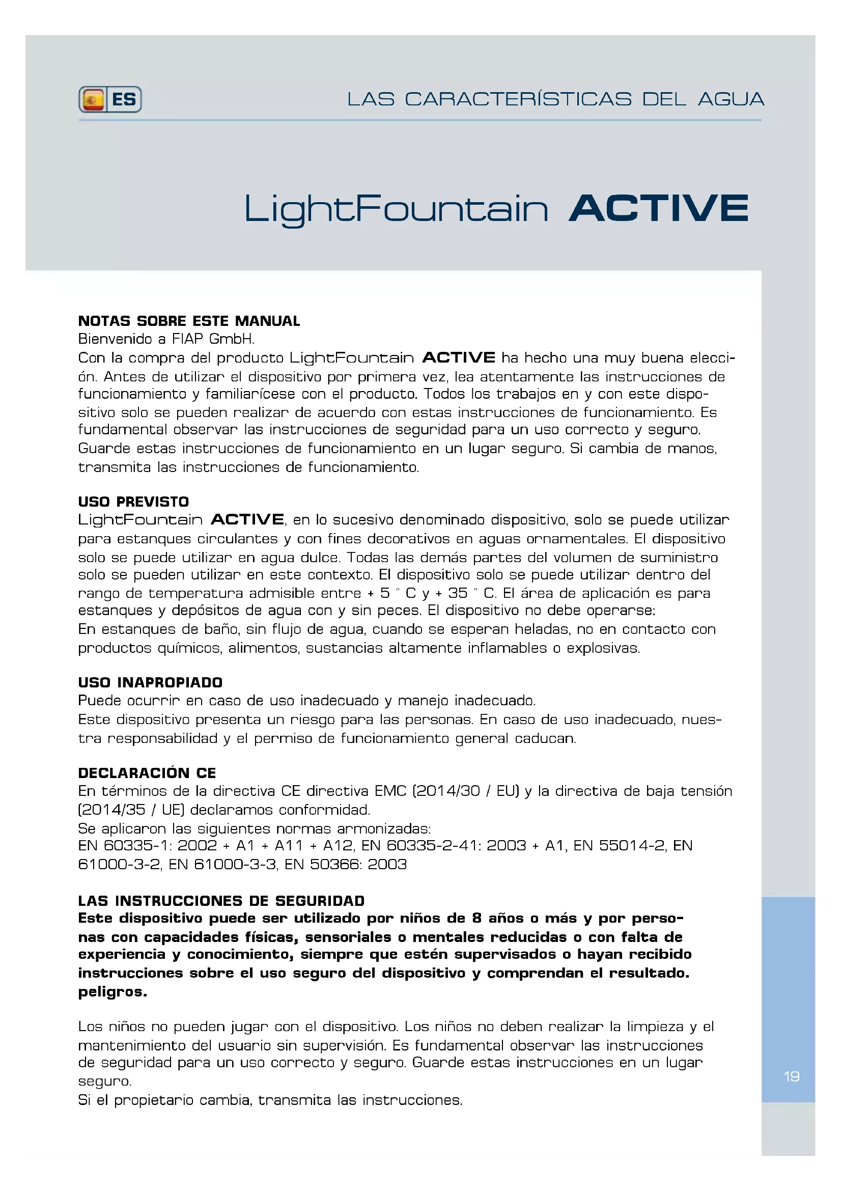 Con la compra del producto LightFountain ACTIVE ha hecho una muy buena elección. Antes de utilizar el dispositivo por primera vez, lea atentamente las instrucciones de funcionamiento y familiarícese con el producto. Todos los trabajos en y con este dispositivo solo se pueden realizar de acuerdo con estas instrucciones de funcionamiento. Es fundamental observar las instrucciones de seguridad para un uso correcto y seguro.