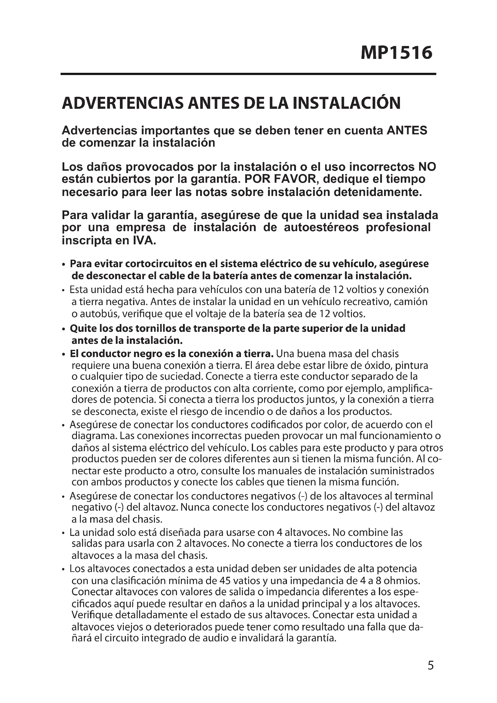 Advertencias importantes que se deben tener en cuenta ANTES de comenzar la instalación Los daños provocados por la instalación o el uso incorrectos NO están cubiertos por la garantía. POR FAVOR, dedique el tiempo necesario para leer las notas sobre instalación detenidamente. Para validar la garantía, asegúrese de que la unidad sea instalada por una empresa de instalación de autoestéreos profesional inscripta en IVA.